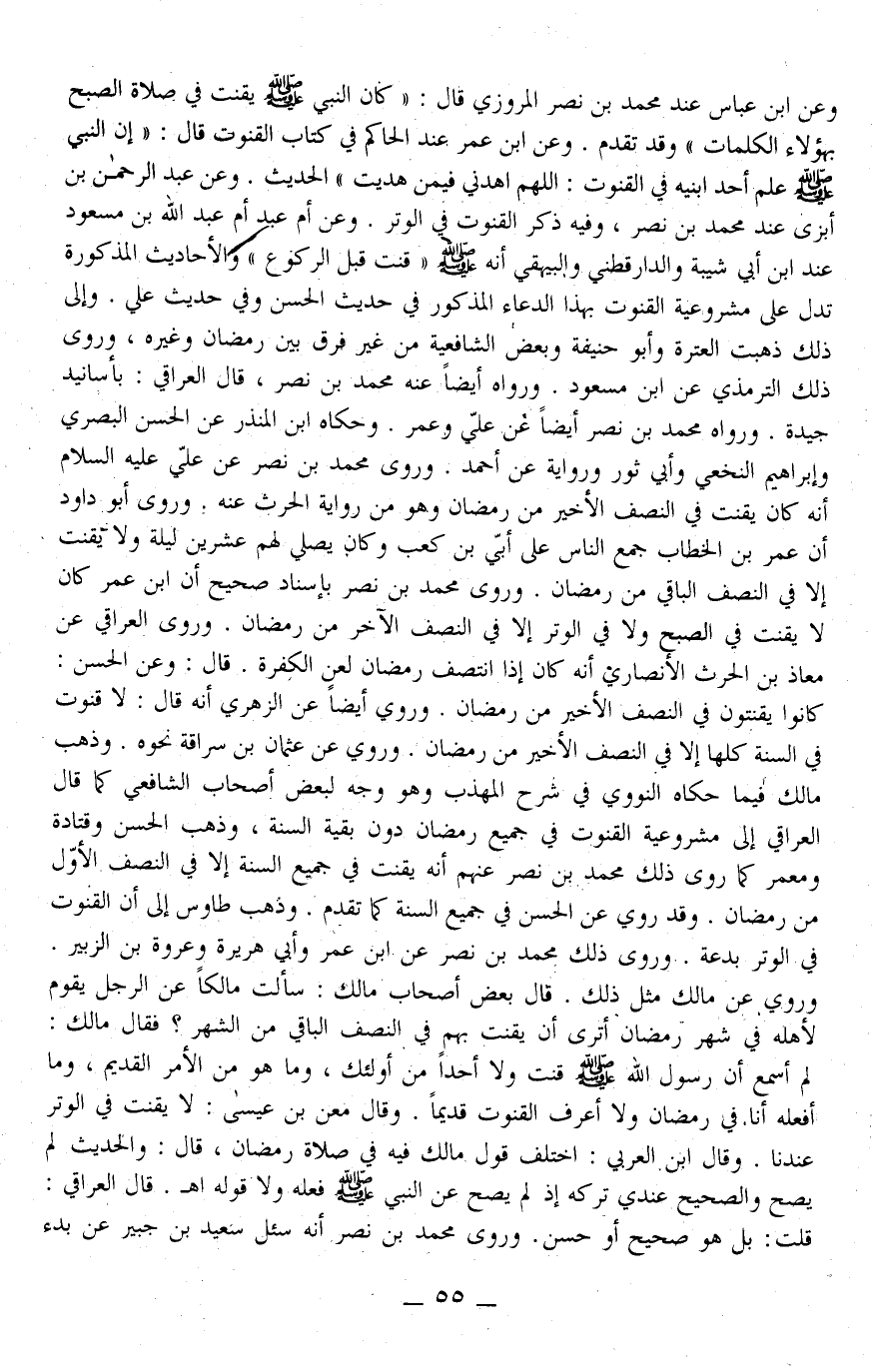 وَرَوَى مُحَمَّدُ بْنُ نَصْرٍ بِإِسْنَادٍ صَحِيحٍ أَنَّ ابْنَ عُمَرَ كَانَ لَا يَقْنُتُ فِي الصُّبْحِ وَلَا فِي الْوِتْرِ إلَّا فِي النِّصْفِ الْآخِرِ مِنْ رَمَضَانَ