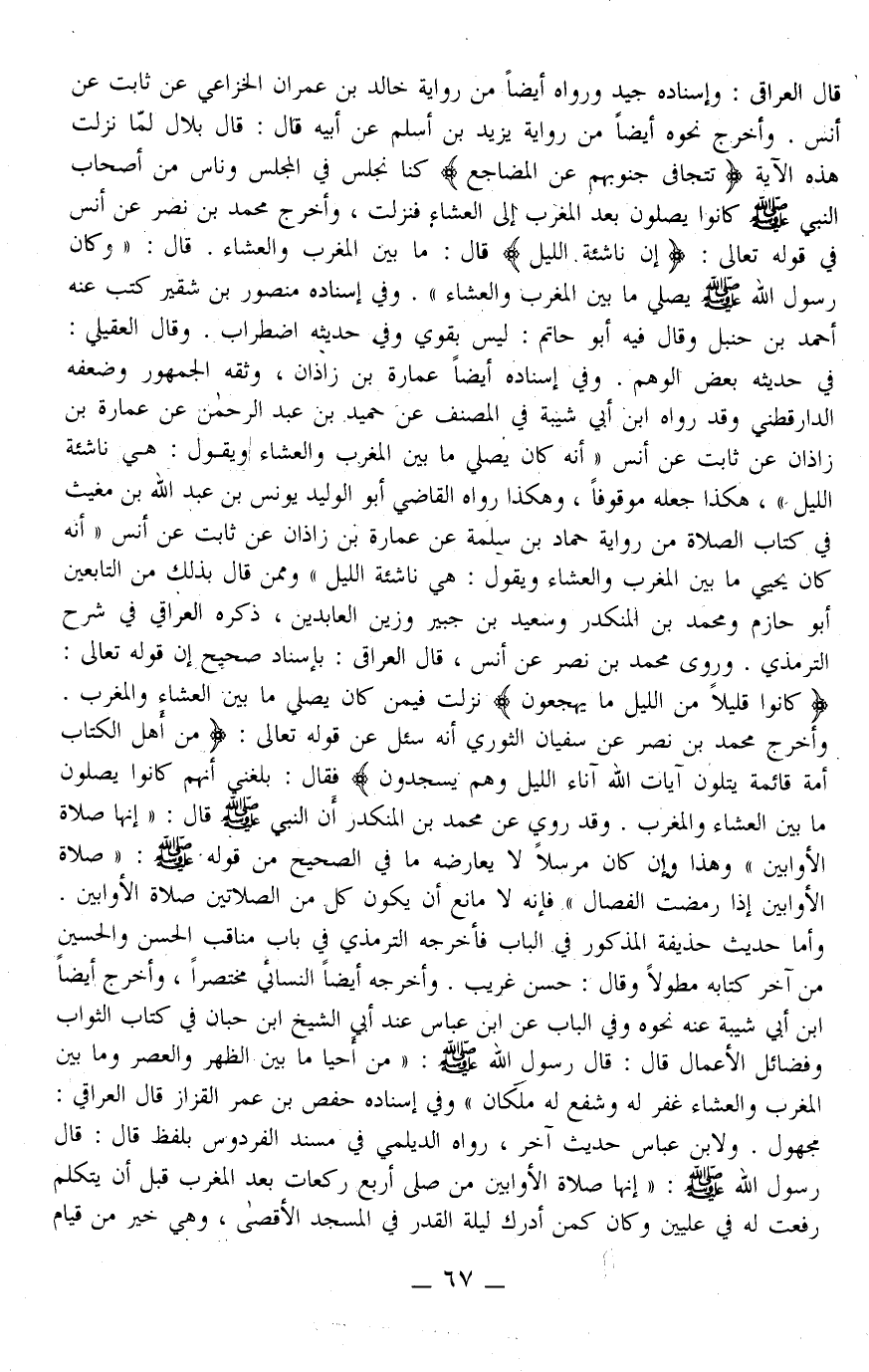وَفِي إسْنَادِهِ مَنْصُورُ بْنُ شُقَيْرٍ، كَتَبَ عَنْهُ أَحْمَدُ بْنُ حَنْبَلٍ، وَقَالَ فِيهِ أَبُو حَاتِمٍ: لَيْسَ بِقَوِيٍّ وَفِي حَدِيثِهِ اضْطِرَابٌ. وَقَالَ الْعُقَيْلِيُّ: فِي حَدِيثِهِ بَعْضُ الْوَهْمِ وَفِي إسْنَادِهِ أَيْضًا عُمَارَةُ بْنُ زَاذَانَ، وَثَّقَهُ الْجُمْهُورُ وَضَعَّفَهُ الدَّارَقُطْنِيّ، وَقَدْ رَوَاهُ ابْنُ أَبِي شَيْبَةَ فِي الْمُصَنَّفِ عَنْ حُمَيْدٍ بْنِ عَبْدِ الرَّحْمَنِ عَنْ عُمَارَةَ بْنِ زَاذَانَ عَنْ ثَابِتٍ عَنْ أَنَسٍ " أَنَّهُ كَانَ يُصَلِّي مَا بَيْنَ الْمَغْرِبِ وَالْعِشَاءِ وَيَقُول: " هِيَ نَاشِئَةُ اللَّيْلِ "، هَكَذَا جَعَلَهُ مَوْقُوفًا، وَهَكَذَا رَوَاهُ الْقَاضِي أَبُو الْوَلِيدِ يُونُسُ بْنُ عَبْدِ اللَّهِ بْنِ مُغِيثٍ فِي كِتَابِ الصَّلَاةِ مِنْ رِوَايَةِ حَمَّادِ بْنِ سَلَمَةَ عَنْ عُمَارَةَ بْنِ زَاذَانَ عَنْ ثَابِتٍ عَنْ أَنَسٍ " أَنَّهُ كَانَ يُحْيِي مَا بَيْنَ الْمَغْرِبِ وَالْعِشَاءِ وَيَقُولُ: هِيَ نَاشِئَةُ اللَّيْلِ " وَمِمَّنْ قَالَ بِذَلِكَ مِنْ التَّابِعِينَ أَبُو حَازِمٍ وَمُحَمَّدُ بْنُ الْمُنْكَدِرِ وَسَعِيدُ بْنُ جُبَيْرٍ وَزَيْنُ الْعَابِدِينَ، ذَكَرَهُ الْعِرَاقِيُّ فِي شَرْحِ التِّرْمِذِيِّ وَرَوَى مُحَمَّدُ بْنُ نَصْرٍ عَنْ أَنَسٍ، قَالَ الْعِرَاقِيُّ: بِإِسْنَادٍ صَحِيحٍ إنَّ قَوْله تَعَالَى: {كَانُوا قَلِيلا مِنَ اللَّيْلِ مَا يَهْجَعُونَ} [الذاريات: 17] نَزَلَتْ فِيمَنْ كَانَ يُصَلِّي مَا بَيْنَ الْعِشَاء وَالْمَغْرِبِ. .