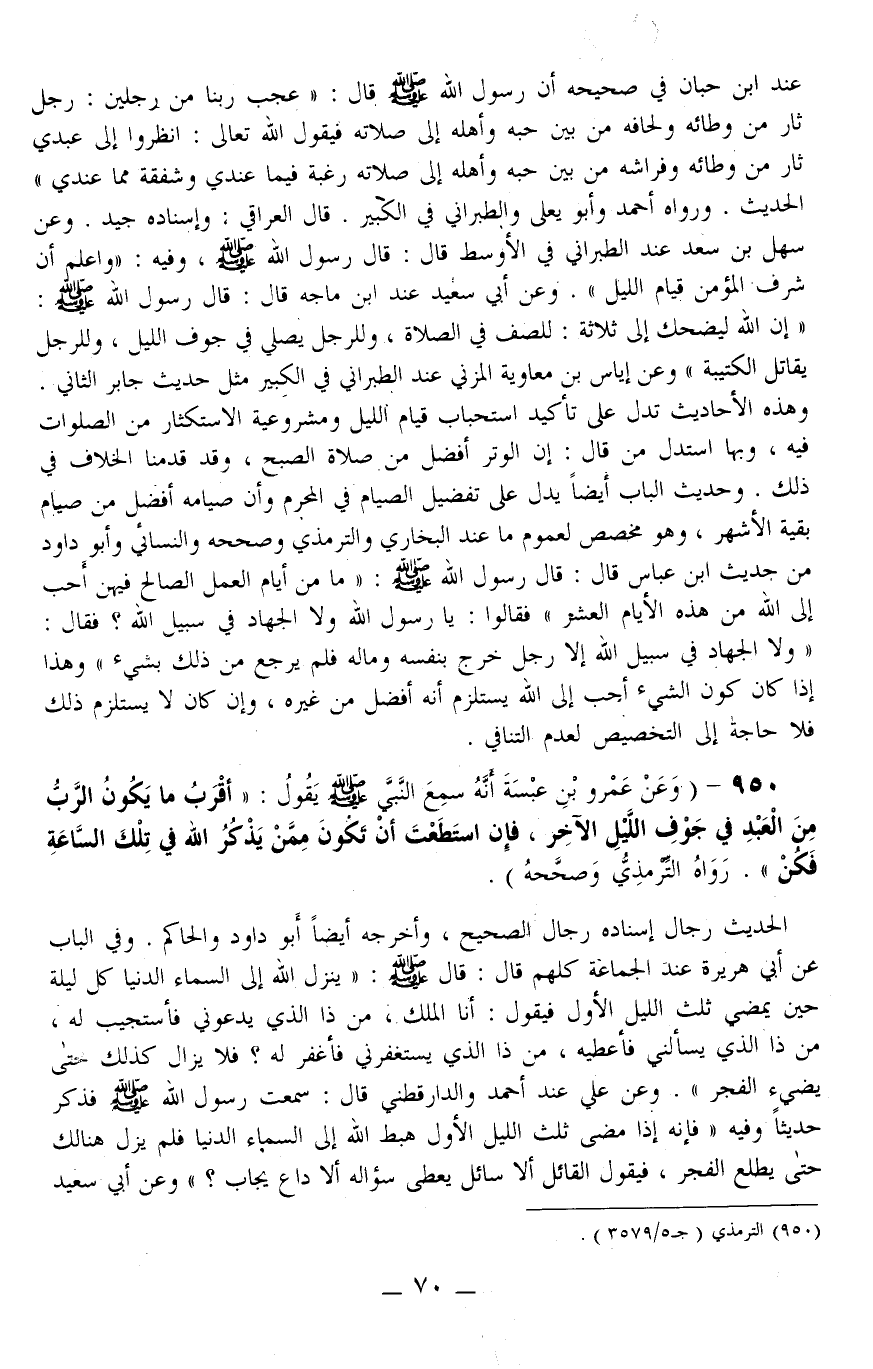950 - (وَعَنْ عَمْرِو بْنِ عَبَسَةَ أَنَّهُ سَمِعَ النَّبِيَّ - صَلَّى اللَّهُ عَلَيْهِ وَسَلَّمَ - يَقُولُ: «أَقْرَبُ مَا يَكُونُ الرَّبُّ مِنْ الْعَبْدِ فِي جَوْفِ اللَّيْلِ الْآخِرِ، فَإِنْ اسْتَطَعْتَ أَنْ تَكُونَ مِمَّنْ يَذْكُرُ اللَّهَ فِي تِلْكَ السَّاعَةِ فَكُنْ» . رَوَاهُ التِّرْمِذِيُّ وَصَحَّحَهُ) . الْحَدِيثُ رِجَالُ إسْنَادِهِ رِجَالُ الصَّحِيحِ، وَأَخْرَجَهُ أَيْضًا أَبُو دَاوُد وَالْحَاكِمُ وَفِي الْبَابِ عَنْ أَبِي هُرَيْرَةَ عِنْدَ الْجَمَاعَةِ كُلِّهِمْ قَالَ: قَالَ - صَلَّى اللَّهُ عَلَيْهِ وَسَلَّمَ -: «يَنْزِلُ اللَّهُ إلَى السَّمَاءِ الدُّنْيَا كُلَّ لَيْلَةٍ حِينَ يَمْضِي ثُلُثُ اللَّيْلِ الْأَوَّلِ فَيَقُولُ: أَنَا الْمَلِكُ، مَنْ ذَا الَّذِي يَدْعُونِي فَأَسْتَجِيبَ لَهُ، مَنْ ذَا الَّذِي يَسْأَلُنِي فَأُعْطِيَهُ، مَنْ ذَا الَّذِي يَسْتَغْفِرُنِي فَأَغْفِرَ لَهُ؟ فَلَا يَزَالُ كَذَلِكَ حَتَّى يُضِيءَ الْفَجْرُ»