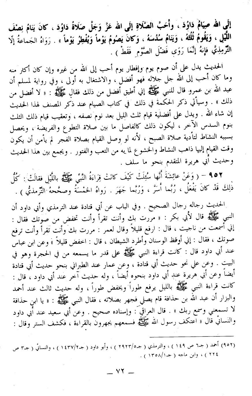 952 - (وَعَنْ عَائِشَةَ «أَنَّهَا سُئِلَتْ كَيْفَ كَانَتْ قِرَاءَةُ النَّبِيِّ - صَلَّى اللَّهُ عَلَيْهِ وَسَلَّمَ - بِاللَّيْلِ فَقَالَتْ: كُلُّ ذَلِكَ قَدْ كَانَ يَفْعَلُ، رُبَّمَا أَسَرَّ، وَرُبَّمَا جَهَرَ» رَوَاهُ الْخَمْسَةُ وَصَحَّحَهُ التِّرْمِذِيُّ)