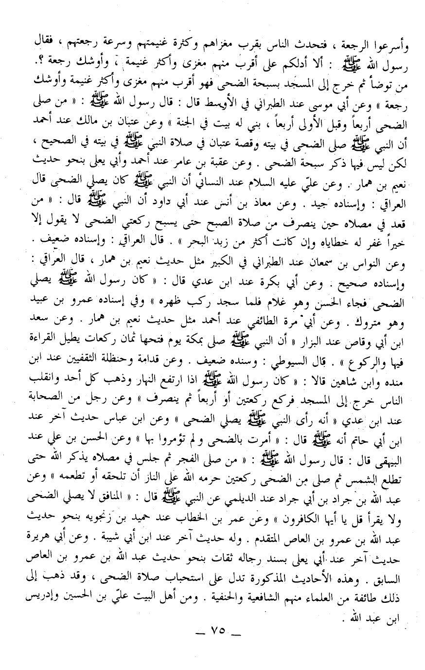 وَعَنْ عُمَرَ بْنِ الْخَطَّابِ عِنْدَ حُمَيْدٍ بْنِ زَنْجُوَيْهِ بِنَحْوِ حَدِيثِ عَبْدِ اللَّهِ بْنِ عَمْرِو بْنِ الْعَاصِ الْمُتَقَدِّمِ وَلَهُ حَدِيثٌ آخَرُ عِنْدَ ابْنِ أَبِي شَيْبَةَ. وَعَنْ أَبِي هُرَيْرَةَ حَدِيثٌ آخَرُ عِنْدَ أَبِي يَعْلَى بِسَنَدٍ رِجَالُهُ ثِقَاتٌ بِنَحْوِ حَدِيثِ عَبْدِ اللَّهِ بْنِ عَمْرِو بْنِ الْعَاصِ السَّابِقِ. وَهَذِهِ الْأَحَادِيثُ الْمَذْكُورَةُ تَدُلُّ عَلَى اسْتِحْبَابِ صَلَاةِ الضُّحَى، وَقَدْ ذَهَبَ إلَى ذَلِكَ طَائِفَةٌ مِنْ الْعُلَمَاءِ مِنْهُمْ الشَّافِعِيَّةُ وَالْحَنَفِيَّةُ، وَمِنْ أَهْل الْبَيْتِ عَلِيُّ بْنُ الْحُسَيْنِ وَإِدْرِيسُ بْنُ عَبْدِ اللَّهِ