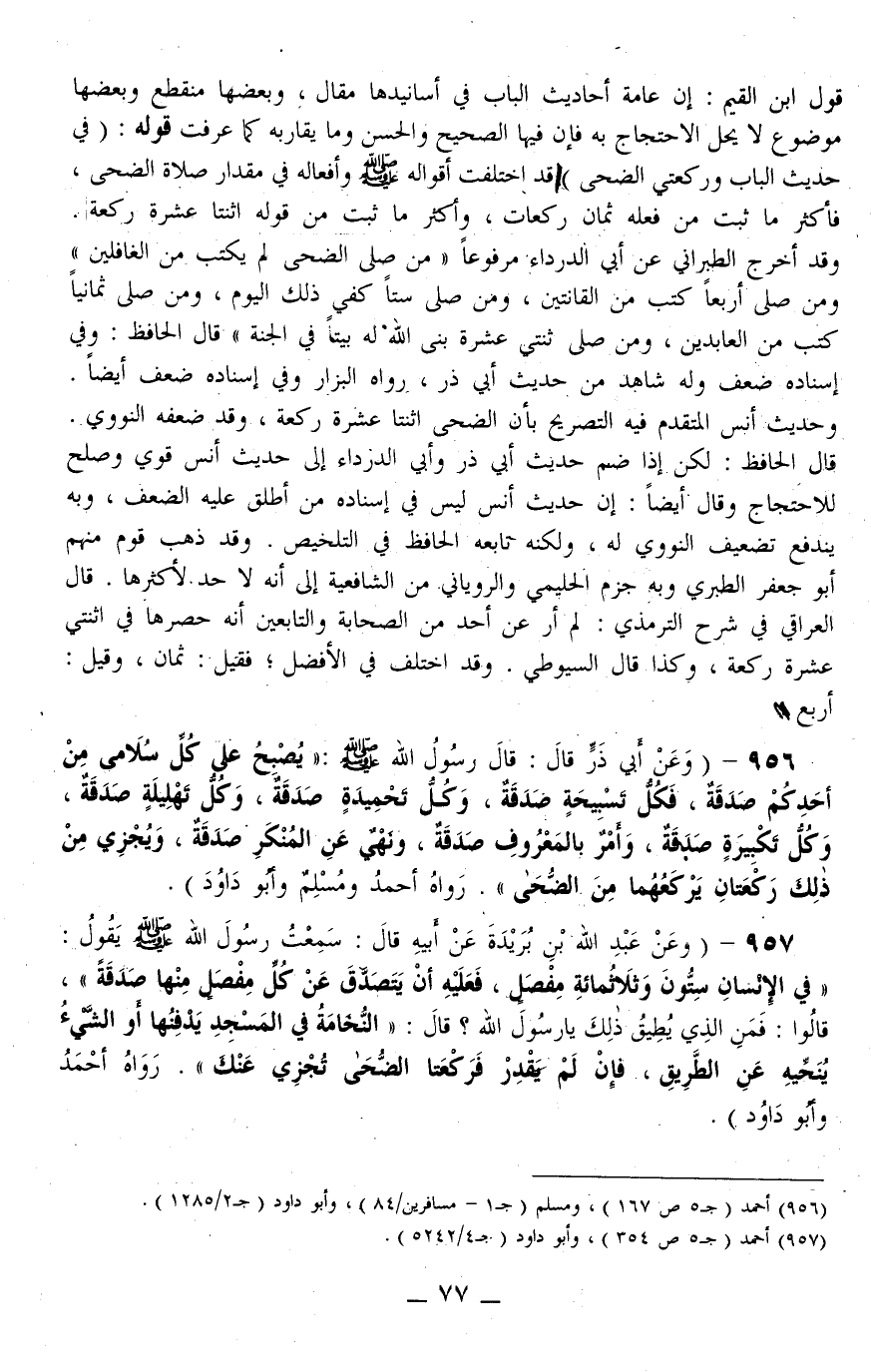 وَحَدِيثُ أَنَسٍ الْمُتَقَدِّمُ فِيهِ التَّصْرِيحُ بِأَنَّ الضُّحَى اثْنَتَا عَشْرَةَ رَكْعَةً، وَقَدْ ضَعَّفَهُ النَّوَوِيُّ. قَالَ الْحَافِظُ: لَكِنْ إذَا ضُمَّ حَدِيثُ أَبِي ذَرٍّ وَأَبِي الدَّرْدَاءِ إلَى حَدِيثَ أَنَسٍ قَوِيَ وَصَلُحَ لِلِاحْتِجَاجِ، وَقَالَ أَيْضًا: إنَّ حَدِيثَ أَنَسٍ لَيْسَ فِي إسْنَادِهِ مَنْ أُطْلِقَ عَلَيْهِ الضَّعْفُ، وَبِهِ يَنْدَفِع تَضْعِيفُ النَّوَوِيِّ لَهُ، وَلَكِنَّهُ تَابَعَهُ الْحَافِظُ فِي التَّلْخِيصِ. وَقَدْ ذَهَبَ قَوْمٌ مِنْهُمْ أَبُو جَعْفَرٍ الطَّبَرِيُّ وَبِهِ جَزَمَ الْحَلِيمِيُّ وَالرُّويَانِيُّ مِنْ الشَّافِعِيَّةِ إلَى أَنَّهُ لَا حَدّ لِأَكْثَرِهَا