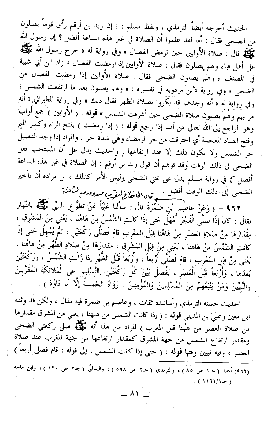 962 - (وَعَنْ عَاصِمِ بْنِ ضَمْرَةَ قَالَ: «سَأَلْنَا عَلِيًّا عَنْ تَطَوُّعِ النَّبِيِّ - صَلَّى اللَّهُ عَلَيْهِ وَسَلَّمَ - بِالنَّهَارِ فَقَالَ: كَانَ إذَا صَلَّى الْفَجْرَ أَمْهَلَ حَتَّى إذَا كَانَتْ الشَّمْسُ مِنْ هَاهُنَا، يَعْنِي مِنْ الْمَشْرِقِ، مِقْدَارُهَا مِنْ صَلَاةِ الْعَصْرِ مِنْ هَاهُنَا قِبَلَ الْمَغْرِبِ قَامَ فَصَلَّى رَكْعَتَيْنِ، ثُمَّ يُمْهِلُ حَتَّى إذَا كَانَتْ الشَّمْسُ مِنْ هَاهُنَا، يَعْنِي مِنْ قِبَلِ الْمَشْرِقِ، مِقْدَارُهَا مِنْ صَلَاةِ الظُّهْرِ مِنْ هَاهُنَا، يَعْنِي مِنْ قِبَلِ الْمَغْرِبِ، قَامَ فَصَلَّى أَرْبَعًا، وَأَرْبَعًا قَبْلَ الظُّهْرِ إذَا زَالَتْ الشَّمْسُ، وَرَكْعَتَيْنِ بَعْدَهَا، وَأَرْبَعًا قَبْلَ الْعَصْرِ، يَفْصِلُ بَيْنَ كُلِّ رَكْعَتَيْنِ بِالتَّسْلِيمِ عَلَى الْمَلَائِكَةِ الْمُقَرَّبِينَ وَالنَّبِيِّينَ وَمَنْ يَتْبَعُهُمْ مِنْ الْمُسْلِمِينَ وَالْمُؤْمِنِينَ» رَوَاهُ الْخَمْسَةُ إلَّا أَبَا دَاوُد) . الْحَدِيثُ حَسَّنَهُ التِّرْمِذِيُّ وَأَسَانِيدُهُ ثِقَاتٌ وَعَاصِمُ بْنُ ضَمْرَةَ فِيهِ مَقَالٌ، وَلَكِنْ قَدْ وَثَّقَهُ ابْنُ مَعِينٍ وَعَلِيُّ بْنُ الْمَدِينِيِّ قَوْلُهُ: (إذَا كَانَتْ الشَّمْسُ مِنْ هَهُنَا، يَعْنِي مِنْ الْمَشْرِقِ مِقْدَارُهَا مِنْ صَلَاةِ الْعَصْرِ مِنْ هَهُنَا قِبَلَ الْمَغْرِبِ) الْمُرَادُ مِنْ هَذَا أَنَّهُ - صَلَّى اللَّهُ عَلَيْهِ وَسَلَّمَ - صَلَّى رَكْعَتِي الضُّحَى وَمِقْدَارُ ارْتِفَاعِ الشَّمْسِ مِنْ جِهَةِ الْمَشْرِقِ كَمِقْدَارِ ارْتِفَاعِهَا مِنْ جِهَةِ الْمَغْرِبِ عِنْدَ صَلَاةِ الْعَصْرِ، وَفِيهِ تَبْيِينُ وَقْتِهَا قَوْلُهُ: (حَتَّى إذَا كَانَتْ الشَّمْسُ، إلَى قَوْلِهِ: قَامَ فَصَلَّى أَرْبَعًا) .