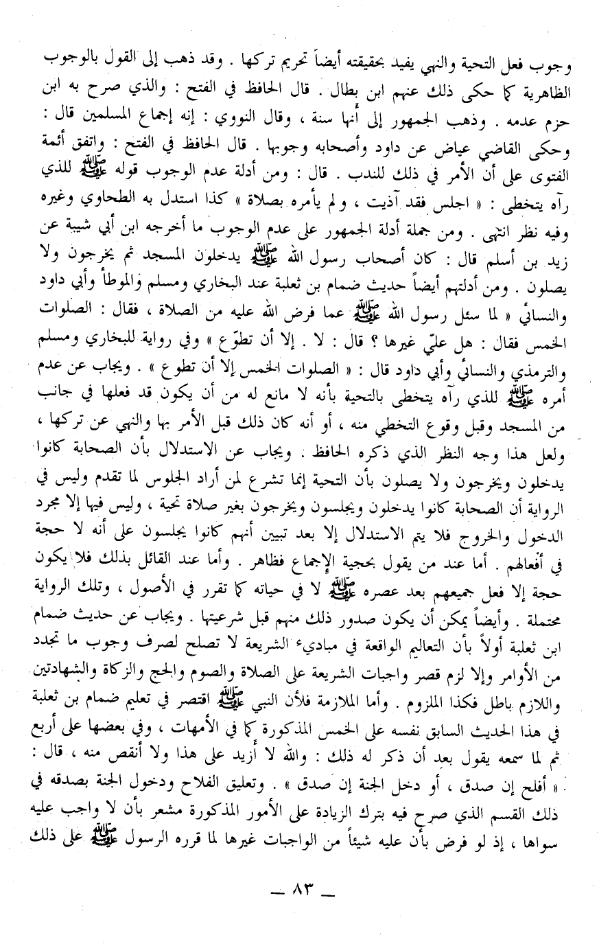 ـــــــــــــــــــــــــــــQوُجُوبِ فِعْلِ التَّحِيَّةِ وَالنَّهْي يُفِيدُ بِحَقِيقَتِهِ أَيْضًا تَحْرِيمَ تَرْكِهَا. وَقَدْ ذَهَبَ إلَى الْقَوْلِ بِالْوُجُوبِ الظَّاهِرِيَّةُ كَمَا حَكَى ذَلِكَ عَنْهُمْ ابْنُ بَطَّالٍ. قَالَ الْحَافِظُ فِي الْفَتْحِ: وَاَلَّذِي صَرَّحَ بِهِ ابْنُ حَزْمٍ عَدَمُهُ