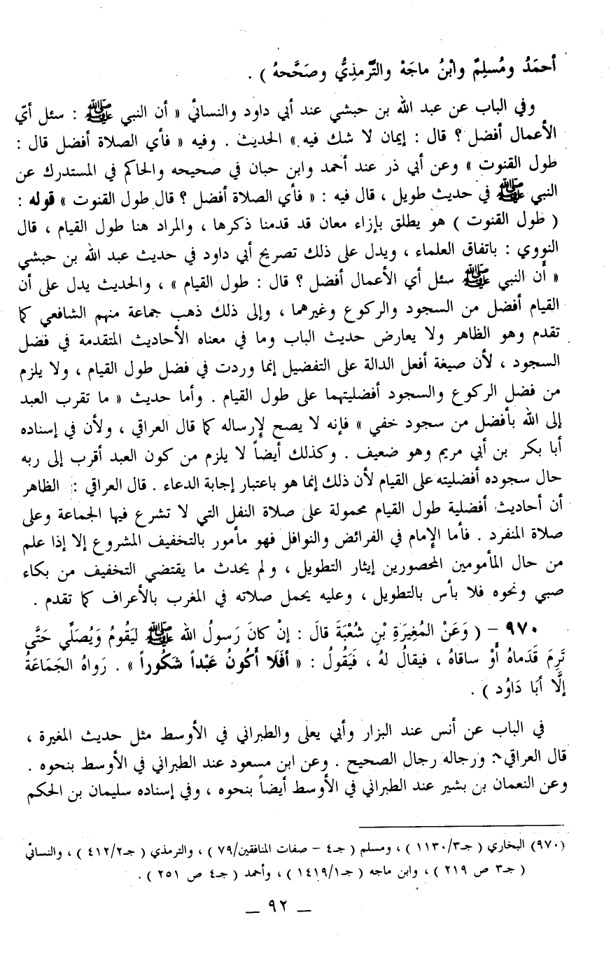 970 - (وَعَنْ الْمُغِيرَةِ بْنِ شُعْبَةَ قَالَ: «إنْ كَانَ رَسُولُ اللَّهِ - صَلَّى اللَّهُ عَلَيْهِ وَسَلَّمَ - لَيَقُومُ وَيُصَلِّي حَتَّى تَرِمَ قَدَمَاهُ أَوْ سَاقَاهُ، فَيُقَالُ لَهُ، فَيَقُولُ: أَفَلَا أَكُونُ عَبْدًا شَكُورًا» . رَوَاهُ الْجَمَاعَةُ إلَّا أَبَا دَاوُد) .