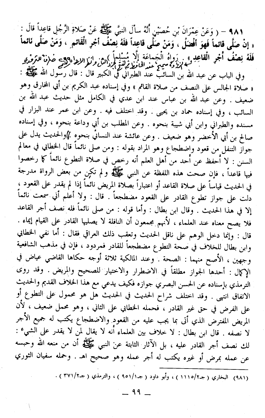وَعَنْ «عِمْرَانَ بْنِ حُصَيْنٍ أَنَّهُ سَأَلَ النَّبِيَّ - صَلَّى اللَّهُ عَلَيْهِ وَسَلَّمَ - عَنْ صَلَاةِ الرَّجُلِ قَاعِدًا قَالَ: إنْ صَلَّى قَائِمًا فَهُوَ أَفْضَلُ، وَمَنْ صَلَّى قَاعِدًا فَلَهُ نِصْفُ أَجْرِ الْقَائِمِ، وَمَنْ صَلَّى نَائِمًا فَلَهُ نِصْفُ أَجْرِ الْقَاعِدِ» . رَوَاهُ الْجَمَاعَةُ إلَّا مُسْلِمًا) .
