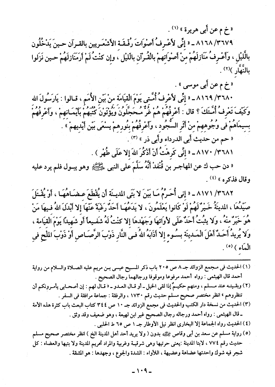 3682/ 8171 - "إِنّى أُحَرِّمُ مَا بَيْنَ لابَتَى المدينَةِ أَن يُقْطَعَ عِضَاهُهَا، أوْ يُقْتَلَ صَيْدُهَا، المدينَةُ خَيْرٌ لَهُمْ لَوْ كَانوا يَعْلَمُونَ، لا يَدَعُهَا أَحَدٌ رَغْبَةً عَنْهَا إِلا أَبْدَلَ اللَّهُ فِيهَا مَنْ هُوَ خَيْرٌ مِنْهُ، وَلا يثبُتُ أَحَدٌ عَلَى لأوَائِهَا وَجَهْدهَا إِلا كنْتُ لَهُ شَفيعًا أو شَهيدًا يَوْمَ الْقيَامة، وَلا يُريدُ أَحَدٌ أَهْلَ الْمَدينَة بسُوء إِلا أَذَابَهُ اللَّهُ في النَّارِ ذَوْبَ الرَّصَاصِ أَوْ ذَوْبَ الملْحِ فِى الْمَاءِ) (¬5).