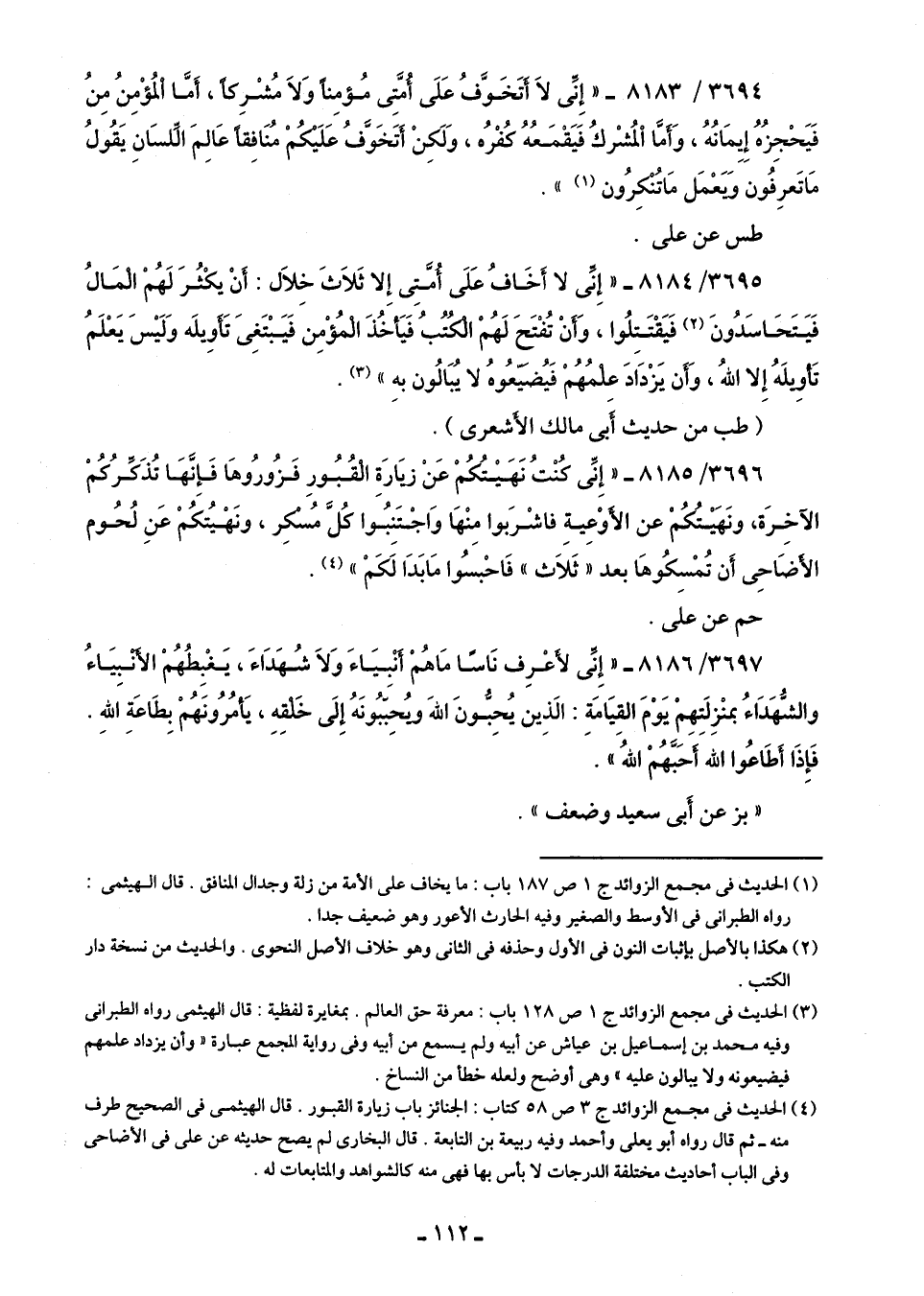 3695/ 8184 - "إِنِّى لا أَخَافُ عَلَى أُمَّتِى إِلا ثَلَاثَ خِلَال: أنْ يكْثُرَ لَهُمْ الْمَالُ فَيَتَحَاسَدُونَ (¬2) فَيَقْتَتِلُوا، وَأَنْ تُفْتَحَ لَهُم الكْتُبُ فَيَأخُذَ المُؤْمِن فَيَبْتَغِى تَأوِيلَه وَلَيْسَ يعلَمُ تَأوِيلَهُ إِلا اللَّهُ، وَأن يَزْدَادَ عِلمُهُم فَيُضيعُوهُ لا يُبَالُون بهِ" (¬3).