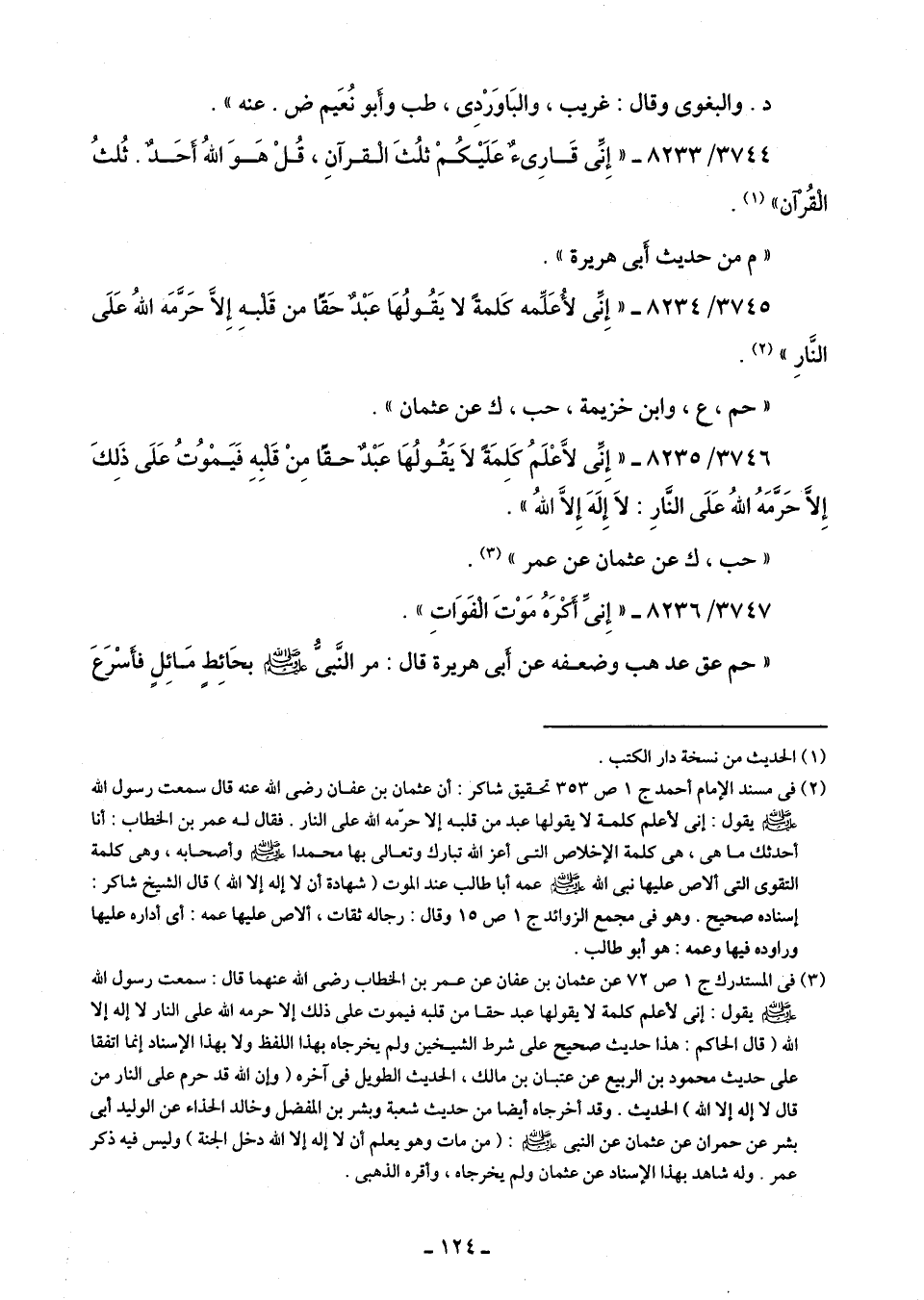 3745/ 8234 - "إِنِّى لأُعَلِّمه كلمةً لا يَقُولُهَا عَبْدٌ حَقًّا من قَلبهِ إِلَّا حَرَّمَه اللَّهُ عَلَى النَّارِ" (¬2).