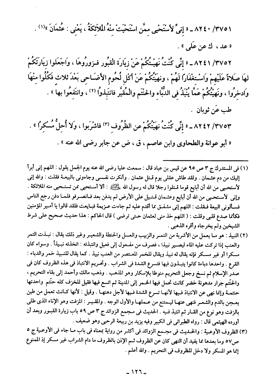 3752/ 8241 - "إِنِّى كُنْتُ نَهيْتُكُمْ عَنْ زِيَارَة الْقبُور فزورُوهَا، وَاجْعَلوا زِيَارَتَكُمْ لهَا صَلاةً عَلَيهِمْ وَاسْتغفَارًا لَهُمْ، ونهَيْتُكُمْ عَنْ أَكلِ لُحُومِ الأضَاحِى بَعْدَ ثلاثٍ فَكُلُوا مِنْهَا وَادخِرُوا، ونَهيْتُكُمْ عَمَّا يُنْبَذُ فِى الدُّبَّاءِ والحنتَم والْمُقيَّر فانتَبِذوُا (¬2)، وانتَفِعُوا بها".