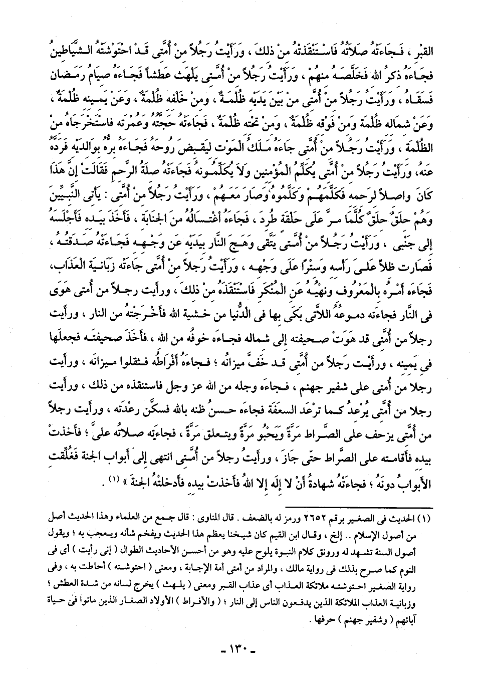 (¬1) الحديث في الصغير برقم 2652 ورمز له بالضعف. قال المناوى: قال جمع من العلماء وهذا الحديث أصل من أصول الإسلام. . إلخ، وقال ابن القيم كان شيخنا يعظم هذا الحديث ويفخم شأنه ويعجب به؛ ويقول أصول السنة تشهد له ورونق كلام النبوة يلوح عليه وهو من أحسن الأحاديث الطوال (إنى رأيت) أى في النوم كما صرح بذلك في رواية مالك، والمراد من أمتى أمة الإجابة، ومعنى (احتوشته) أحاطت به، وفى رواية الصغير احتوشته ملائكة العذاب أى عذاب القبر ومعنى (يلهث) يخرج لسانه من شدة العطش؛ وزبانية العذاب الملائكة الذين يدفعون الناس إلى النار؛ (والأفراط) الأولاد الصغار الذين ماتوا في حياة آبائهم (وشفير جهنم) حرفها.