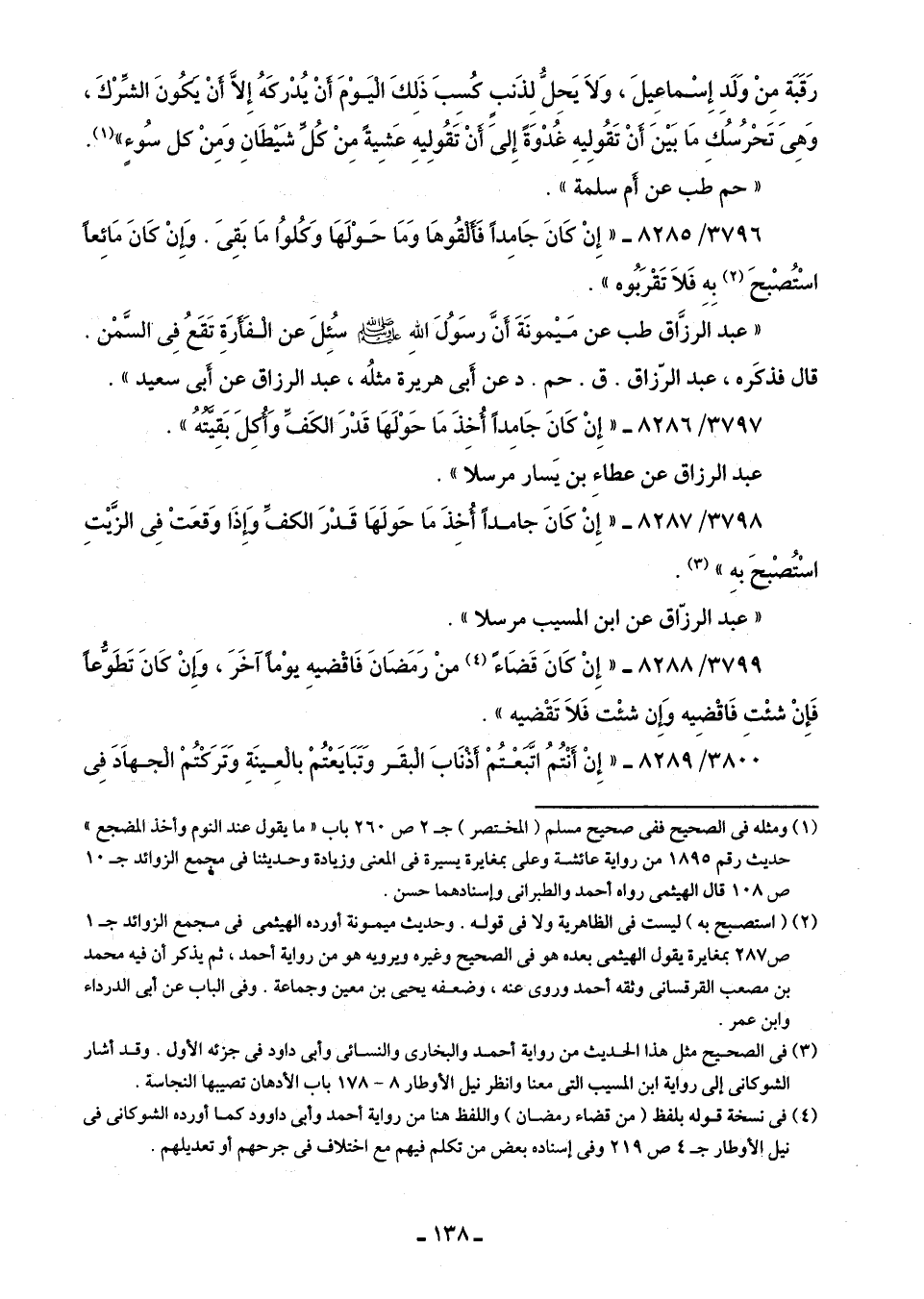 3798/ 8287 - "إِنْ كَانَ جامدًا أُخذَ مَا حَولَهَا قَدْرَ الكفِّ وَإِذَا وَقعَتْ فِى الزَّيْت اسْتُصْبحَ بهِ" (¬3).