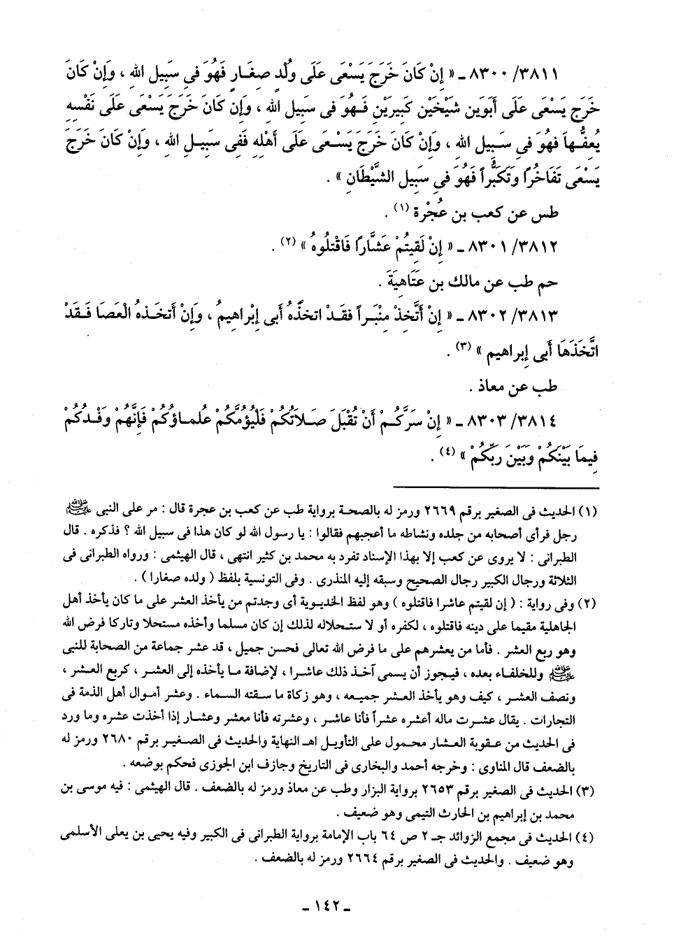 3811/ 8300 - "إِنْ كَانَ خَرَجَ يَسْعَى عَلَى وُلْدٍ صِغَارٍ فَهُوَ فِى سَبِيل اللَّهِ، وَإنْ كَانَ خَرَج يَسْعَى عَلَى أَبَوَين شَيْخَيْن كبِيرَيْنِ فَهُوَ في سَبِيل اللَّهِ، وَإِن كَانَ خَرَجَ يَسْعَى عَلَى نَفْسِهِ يُعِفُّها فهُوَ فِى سَبيل اللَّهِ، وَإنْ كَانَ خَرَجَ يَسْعَى عَلَى أَهْلِهِ فَفِى سَبِيلِ اللَّهِ، وَإنْ كَانَ خَرَجَ يَسْعَى تَفَاخُرًا وَتَكَبُّرًا فَهُوَ فِى سَبِيل الشَّيْطَانِ".