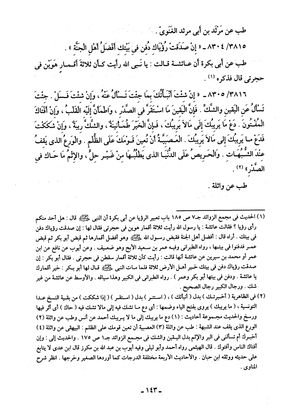 3816/ 8305 - "إِنْ شئْتَ أنْبَأُتُكَ بِمَا جِئْتَ تَسْألُ عَنْهُ، وَإِنْ شِئْتَ فَسَلْ. جِئْتَ تَسْأَلُ عَنِ الْيَقينِ والشَّكِّ. فَإِنَّ الْيَقِينَ مَا اسْتَقَرَّ فِى الصَّدْرِ، وَاطْمَأَنَّ إِلَيْه الْقَلبُ، وَإِنْ أَفْتَاكَ الْمُفْتُونَ. دَعْ مَا يَريِبُكَ إِلَى مَا لَا يَرِيبُكَ، فَإنَّ الْخَيْرَ طُمَأنِينَةٌ، والشَّكَّ رِيبَةٌ، وَإنْ شَكَكْتَ فَدع ما يَرِيبُكَ إِلى مَا لَا يَرِيبُكَ. الْعَصَبِيَّةُ أنْ تُعينَ قَوْمَكَ عَلَى الظُّلْمِ. والْوَرِعُ الذى يَقِفُ عِنْدَ الشُّبُهَاتِ. وَالْحَرِيصُ عَلَى الدُّنْيَا الذى يَطْلُبُهَا مِن غَيْر حِلٍّ، والإِثْمُ مَا حَاك فِى الصَّدْرِ" (¬2).