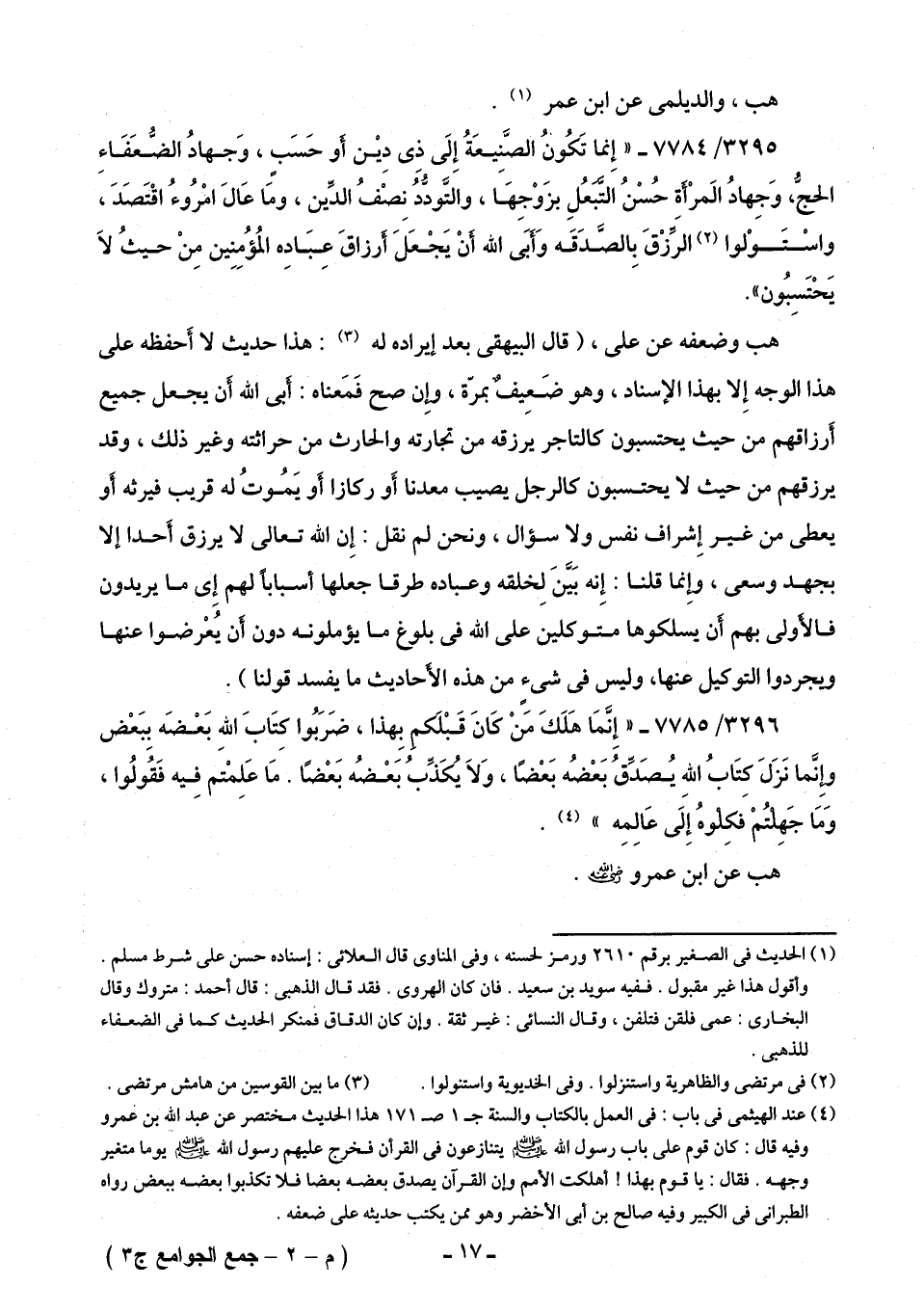 3296/ 7785 - "إِنَّمَا هَلَكَ منْ كَانَ قَبْلَكم بِهذا، ضَرَبُوا كِتَابَ اللَّهِ بَعْضَه بِبَعْض وإِنَّما نَزَلَ كتَابُ اللَّهِ يُصَدِّقُ بَعْضُه بَعْضًا، وَلَا يُكَذِّبُ بَعْضُه بَعْضًا. مَا عَلمْتم فيه فَقُولُوا، وَمَا جَهِلتُمْ فَكِلوهُ إِلَى عَالِمِه" (¬4).