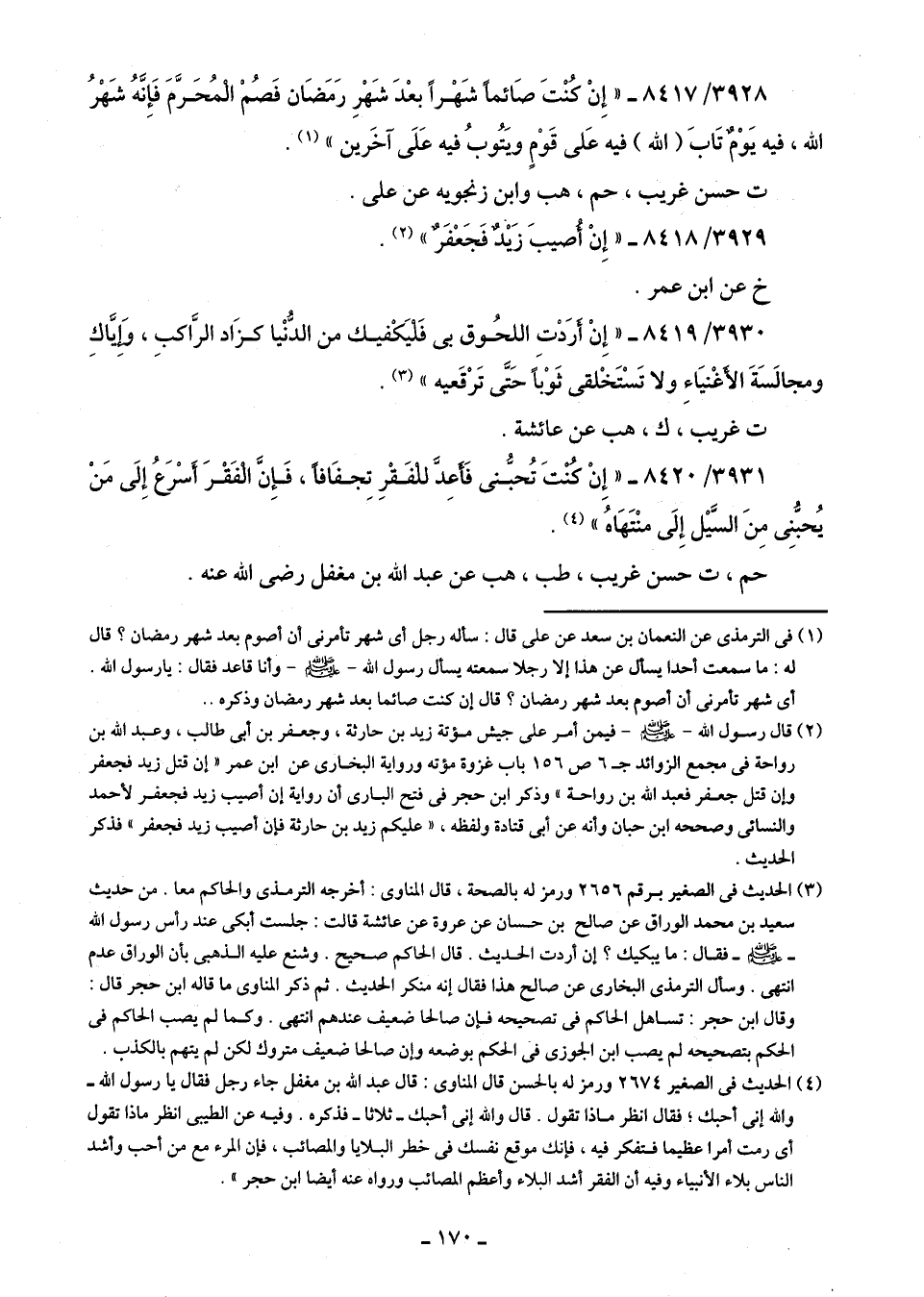3931/ 8420 - "إِنْ كُنْتَ تُحبُّنى فَأَعِدَّ للفَقْرِ تِجفَافًا، فَإِنَّ الفَقْرَ أَسْرعُ إِلَى مَنْ يُحبُّنِى مِنَ السَّيْل إِلَى منْتَهَاهُ" (¬4).
