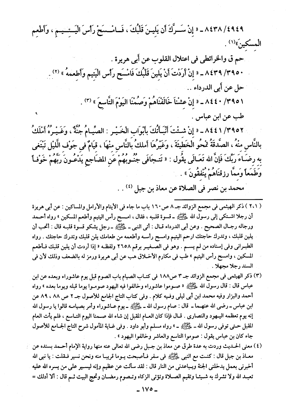 (¬1) و (¬2) ذكر الهيثمى في مجمع الزوائد جـ 8 ص 160 باب ما جاء في الأيتام والأرامل والمساكين: عن أبى هريرة أن رجلا اشتكى إلى رسول اللَّه -صلى اللَّه عليه وسلم- قسوة قلبه، فقال، امسح رأس اليتيم وأطعم المسكين" رواه أحمد ورجاله رجال الصحيح. وعن أبى الدرداء قال: أتى النبى -صلى اللَّه عليه وسلم- رجل يشكو قسوة قلبه قال: أتحب أن يلين قلبك، وتدرك حاجتك ارحم اليتيم وامسح رأسه وأطعمه من طعامك يلن قلبك وتدرك حاجتك. رواه الطبرانى وفى إسناده من لم يسم. وهو في الصغير برقم 2658 ولفظه "إذا أردت أن يلين قلبك فأطعم المسكين، وامسح رأس اليتيم" طب في مكارم الأخلاق هب عن أبى هريرة ورمز له بالضعف وذلك لأن في السند رجلا مجهلا.