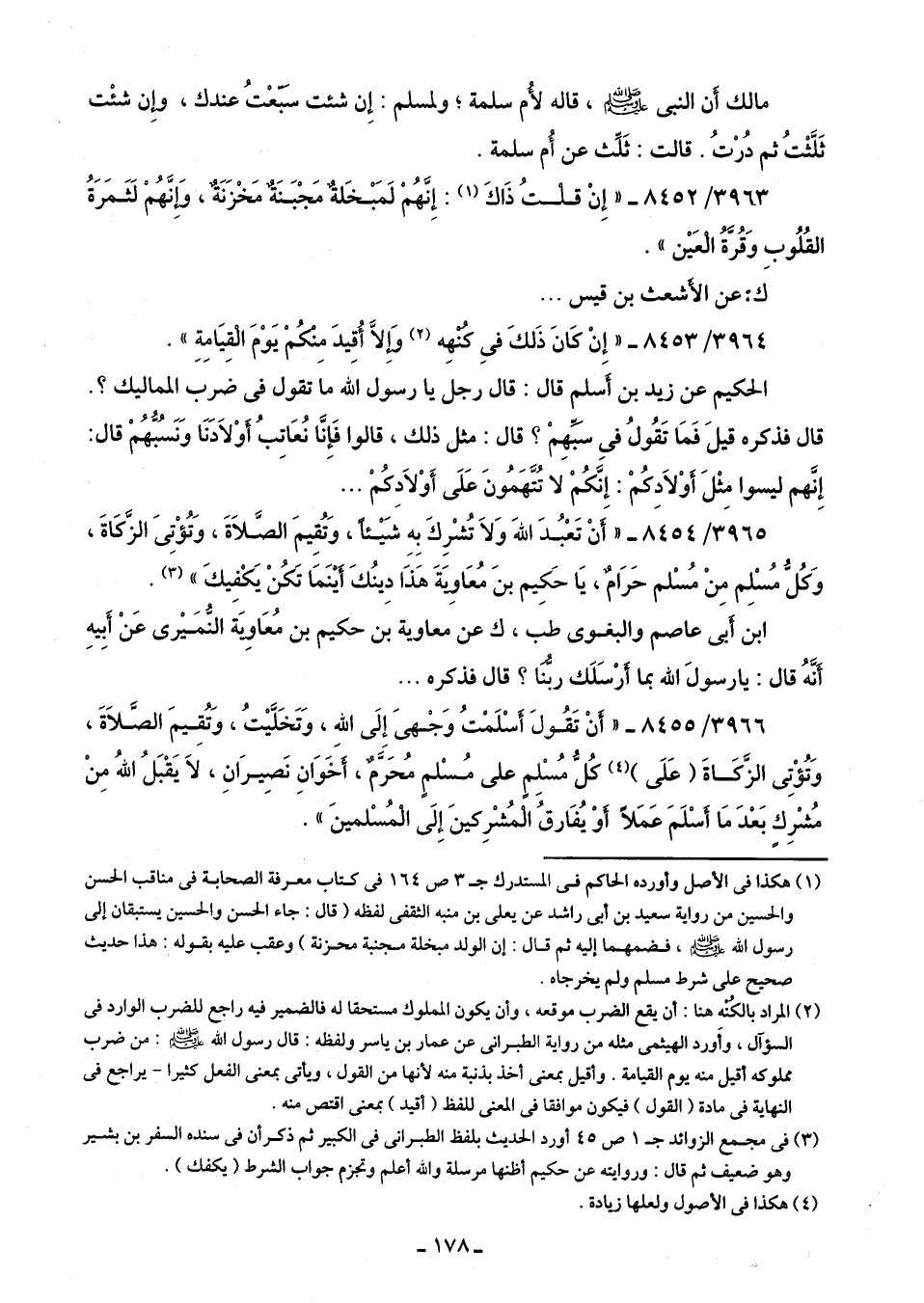 3965/ 8454 - "أَنْ تَعْبُدَ اللَّهَ وَلَا تُشْرِكَ بِهِ شَيْئًا، وَتُقِيمَ الصَّلَاةَ، وَتُؤْتِى الزَّكَاةَ، وَكُلُّ مُسْلِم مِنْ مُسْلم حرَامٌ، يَا حَكِيم بنَ مُعَاوِيَةَ هَذَا دِينُكَ أَيْنَمَا تَكُنْ يَكْفِيكَ" (¬3).