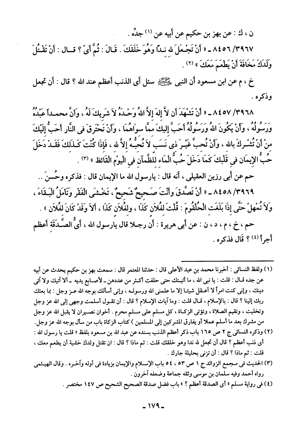 (¬2) وذكره النسائى جـ 2 ص 165 باب ذكر أعظم الذنب بسنده عن عبد اللَّه بن مسعود بلفظ "قلت يا رسول اللَّه: أى ذنب أعظم؟ قال أن تجعل للَّه ندا وهو خلقك قلت: ثم ماذا؟ قال: ان تقتل ولدك خعدمية أن يطعم معك، قلت: ثم ماذا؟ قال: أن تزنى بحليلة جارك.