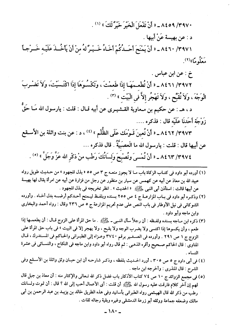 3972/ 8461 - "أنْ تُطعِمَهَا إِذَا طَعمْتَ، وَتَكْسُوَهَا إِذَا اكْتَسَيْتَ، وَلَا تَضْربَ الْوَجْهَ، وَلَا تُقبِّح، وَلَا تَهْجُر إِلَّا فِى البَيْتِ" (¬3).