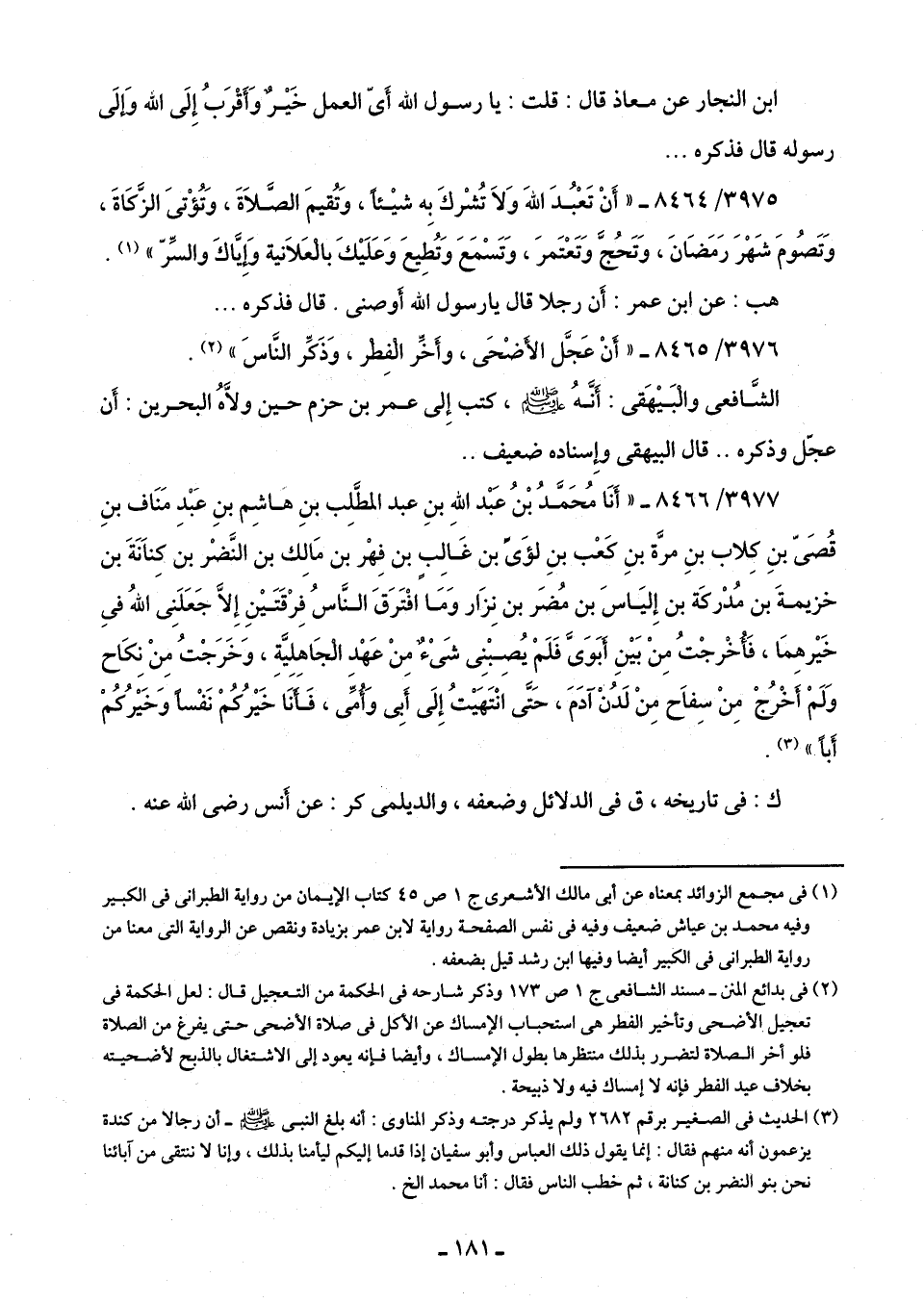 3977/ 8466 - "أنَا محَمَّدُ بْنُ عَبْد اللَّهِ بنِ عبد المطَّلِب بنِ هاشِم بنِ عَبْدِ مَنَاف بنِ قُصَىّ بنِ كِلاب بنِ مرَّة بنِ كَعْب بنِ لؤَىً بن غَالِبٍ بن فِهْر بن مَالِك بن النَّضْر بن كِنانَةَ بن خزيمةَ بن مُدْركَة بن إِليَاسَ بن مُضَر بن نِزَار وَمَا افْتَرَقَ النَّاسُ فِرْقَتَيْنِ إِلَّا جَعَلَنِى اللَّهُ فِى خَيْرهمَا، فَأُخرجْتُ مِنْ بَيْنِ أبَوَىَّ فَلَمْ يُصِبْنِى شَىْءٌ مِنْ عَهْد الجَاهليَّةِ، وَخَرَجْتُ مِنْ نِكَاح وَلَمْ أَخْرُجْ مِنْ سِفاح مِنْ لَدُنْ آدَمَ، حَتَّى انْتَهَيْتُ إِلَى أَبِى وَأُمِّى، فَأَنَا خَيْرُكُمْ نَفْسًا وَخَيْرُكُمْ أَبًا" (¬3).