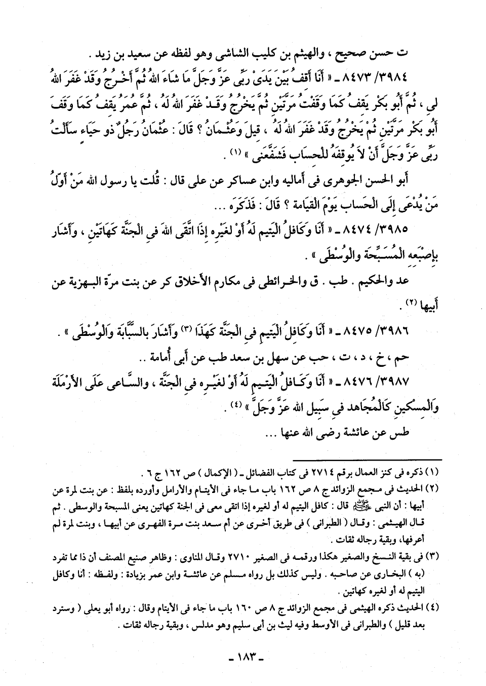 3987/ 8476 - "أنَا وَكَافلُ اليَتيم لَهُ أوْ لغَيْرِه فِى الجَنَّة، والسَّاعى عَلَى الأَرْمَلَة وَالمِسكينِ كَالمُجَاهد فِى سَبِيل اللَّه عَزَّ وَجَلَّ" (¬4).