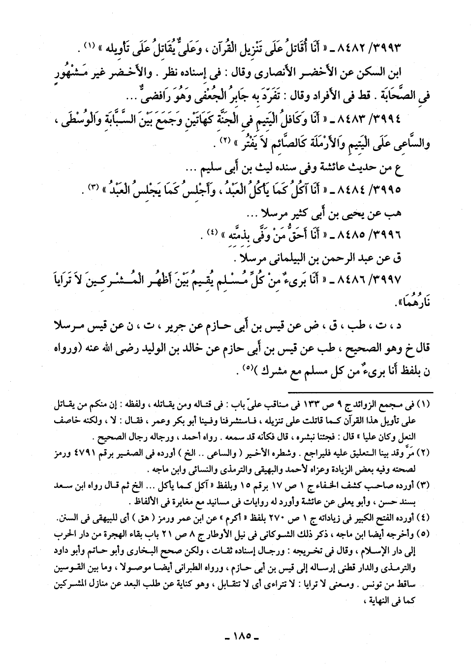 د، ت، طب، ق، ض عن قيس بن أبى حازم عن جرير، ت، ن عن قيس مرسلا قال خ وهو الصحيح، طب عن قيس بن أبى حازم عن خالد بن الوليد رضى اللَّه عنه (ورواه ن بلفظ أَنا برئٌ من كل مسلم مع مشرك) (¬5).