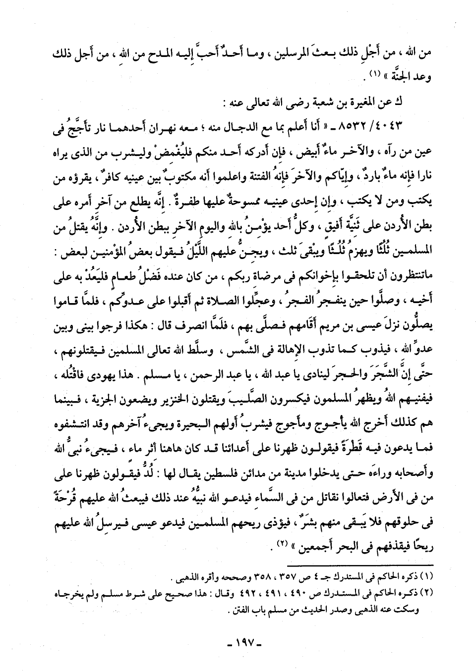 4043/ 8532 - "أَنَا أعلم بما مع الدجال منه؛ معه نهران أَحدهما نار تأَجَّجُ في عين من رآه، والآخر ماءٌ أبيض، فإِن أدركه أَحد منكم فليُغْمِضْ وليشرب من الذى يراه نارا فإِنه ماءٌ باردٌ، وإِيّاكم والآخرَ فإِنهُ الفتنة واعلموا أَنه مكتوبٌ بين عينيه كْافرٌ، يقرؤه من يكتب ومن لا يكتب، وإِن إِحدى عينيه ممسوحةٌ عليها طفرةٌ. إنَّه يطلع من آخرِ أَمره على بطن الأردن على ثَنِيَّة أَفيقٍ، وكلُّ أحد يؤْمِنُ باللَّهِ واليومِ الآخرِ ببطن الأردن. وإِنَّهُ يقتلُ من المسلمين ثُلثًا ويهزمُ ثُلُثًا ويبْقى ثلث، وبجِنُّ عليهم اللَّيْلُ فيقول بعضُ المؤْمنين لبعض: ما تنتظرون أن تلحقوا بإِخوانكم في مرضاة ربكم، من كان عنده فَضْلُ طعامٍ فليَعُدْ به على أخيه، وصلَّوا حين ينفجرُ الفجرُ، وعجِّلوا الصلاة ثم أقبلوا على عدوِّكم، فلمَّا قاموا يصلُّون نزلَ عيسى بن مريم أقَامهم فصلَّى بهم، فلَمَّا انصرف قال: هكذا فرجوا بينى وبين عدوِّ اللَّه، فيذوب كما تذوب الإِهالة في الشَّمس، وسلَّط اللَّه تعالى المسلمين فيقتلونهم، حتَّى إِنَّ الشَّجَرَ والحجرَ لينادى يا عبد اللَّه، يا عبد الرحمن، يا مسلم. هذا يهودى فاقْتُله، فيفنيهم اللَّهُ ويظهرُ المسلمون فيكسرون الصَّليبَ ويقتلون الخنزير ويضعون الجزية، فبينما هم كذلك أَخرج اللَّه يأجوج ومأجوج فيشربُ أَولهم البحيرة ويجئُ آخرهم وقد انتشفوه فما يدعون فيه قَطرَة فيقولون ظهرنا على أَعدائنا قد كان هاهنا أثر ما، فيجئُ نبىُّ اللَّه وأَصحابه وراءَه حتى يدخلوا مدينة من مدائن فلسطين يقال لها: لُدُّ فيقولون ظهرنا على من في الأَرض فتعالوا نقاتل من في السَّماءِ فيدعو اللَّه نبيُّهُ عند ذلك فيبعثُ اللَّه عليهم قُرْحَةً في حلوقهم فلا يَبقى منهم بشَرٌ، فيؤذى ريحهم المسلمين فيدعو عيسى فيرسِلُ اللَّه عليهم ريحًا فيقذفهم في البحر أَجمعين" (¬2).