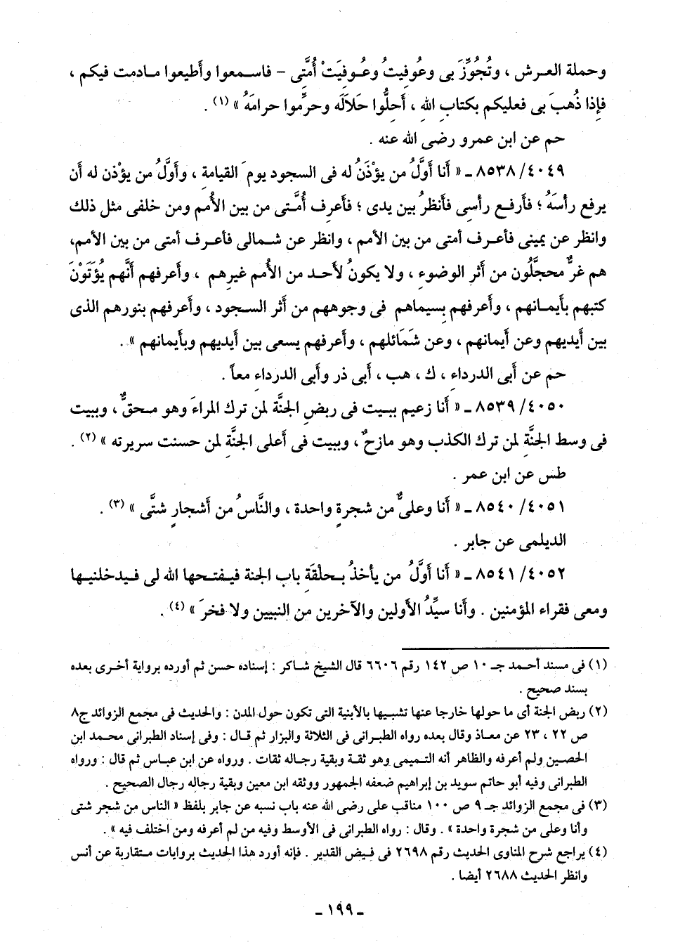 4049/ 8538 - "أَنَا أَوَّلُ من يؤْذَنُ له في السجود يومَ القيامةِ، وأَوَّلُ من يؤْذن له أَن يرفع رأسَهُ؟ فأَرفع رأسِى فأَنظرُ بين يدى؛ فأَعرِف أُمَّتى من بين الأُمم ومن خلفى مثل ذلك وانظر عن يمينى فأعرف أمتى من بين الأمم، وانظر عن شمالى فأعرف أمتى من بين الأمم، هم غرٌّ محجَّلُون من أثر الوضوءِ، ولا يكونُ لأَحد من الأُمم غيرِهم، وأعرفهم أنَّهم يُؤَتَوْنَ كتبهم بأَيمانهم، وأَعرفهم بِسيماهم في وجوههم من أَثر السجود، وأَعرفهم بنورهم الذى بين أَيديهم وعن أَيمانهم، وعن شَمَائلهم، وأَعرفهم يسعى بين أَيديهم وبأَيمانهم".