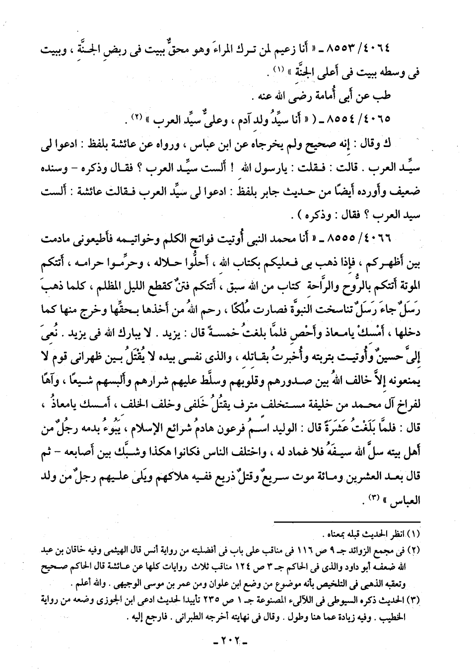 (¬2) في مجمع الزوائد جـ 9 ص 116 في مناقب على باب في أفضليته من رواية أنس قال الهيثمى وفيه خاقان بن عبد اللَّه ضعفه أَبو داود والذى في الحاكم جـ 3 ص 124 مناقب ثلاث روايات كلها عن عائشة قال الحاكم صحيح وتعقبه الذهبى في التلخيص بأنه موضوع من وضع ابن علوان ومن عمر بن موسى الوجيهى. واللَّه أعلم.