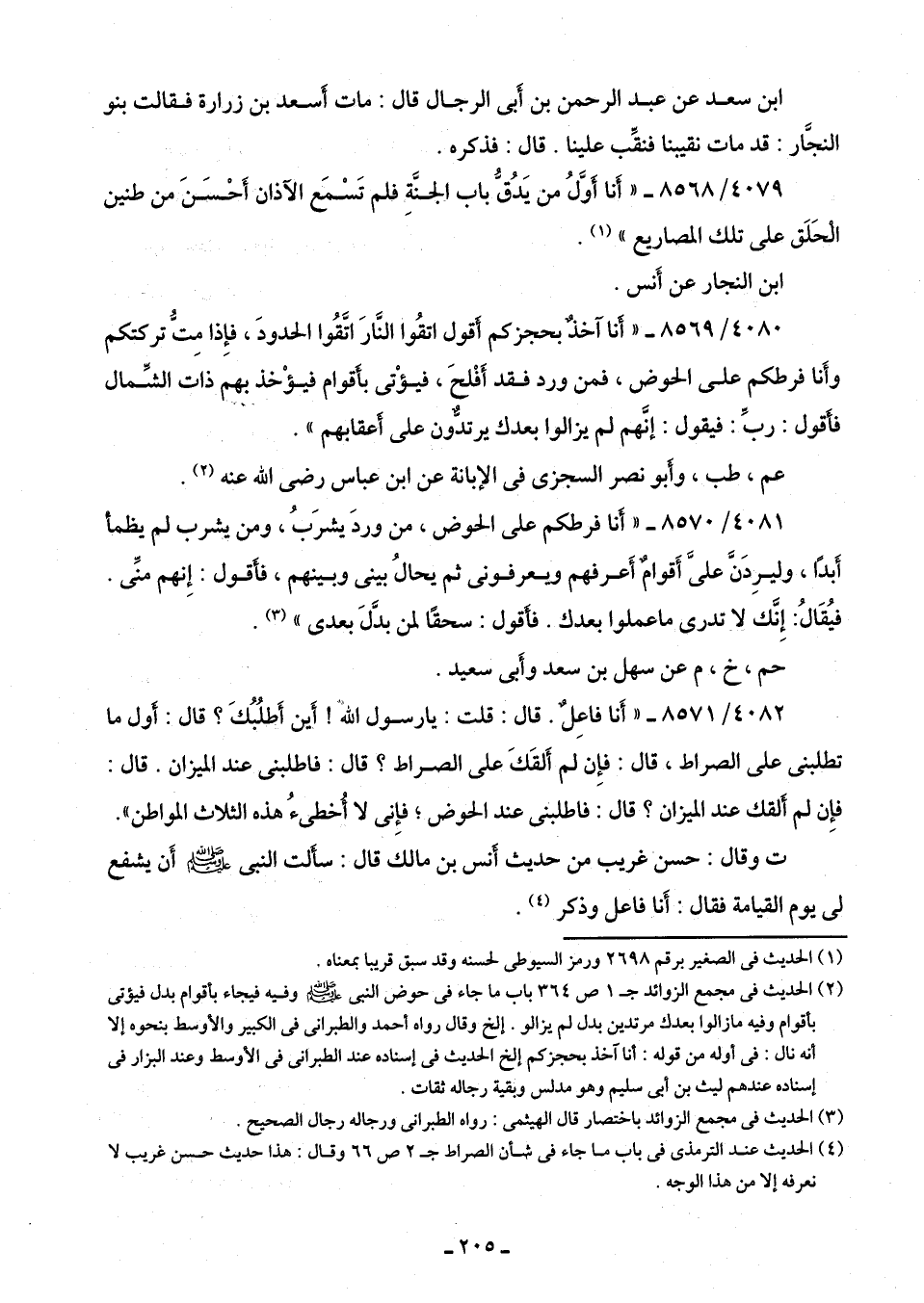 4081/ 8570 - "أَنا فرطكم على الحوض، من وردَ يشرَبُ، ومن يشرب لم يظمأ أَبدًا، وليرِدَنَّ علىَّ أَقوامٌ أَعرفهم ويعرفونى ثمَّ يحالُ بينى وبينهم، فأَقول: إِنهم منِّى. فيُقَالُ: إِنَّك لا تدرى ما عملوا بعدك. فأَقول: سحقًا لمن بدَّلَ بعدى" (¬3).