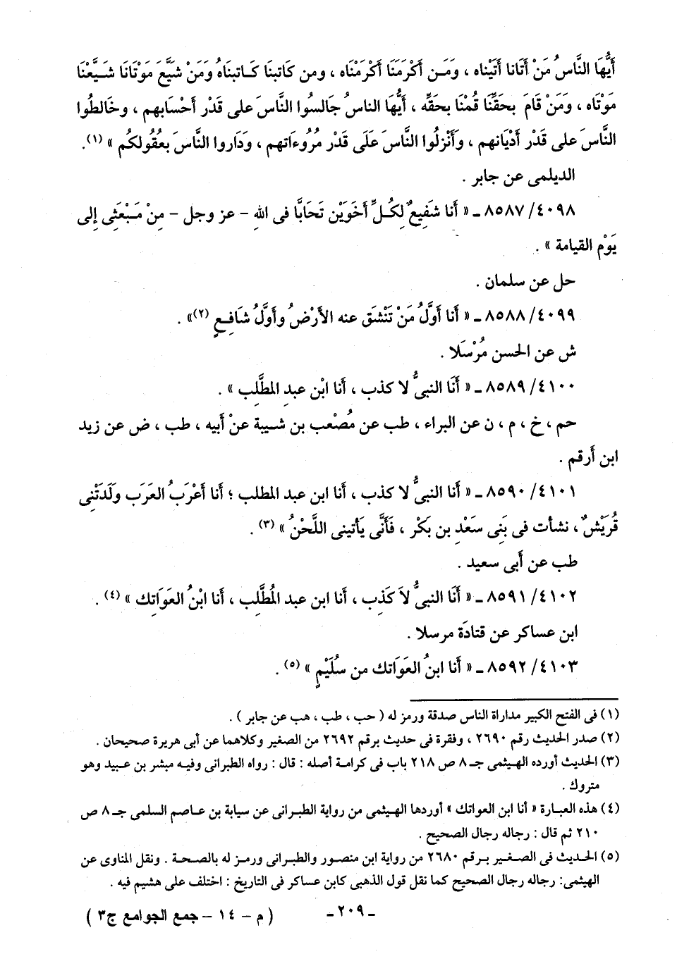 (¬5) الحديث في الصغير برقم 2680 من رواية ابن منصور والطبرانى ورمز له بالصحة. ونقل المناوى عن الهيثمى: رجاله رجال الصحيح كما نقل قول الذهبى كابن عساكر في التاريخ: اختلف على هشيم فيه.