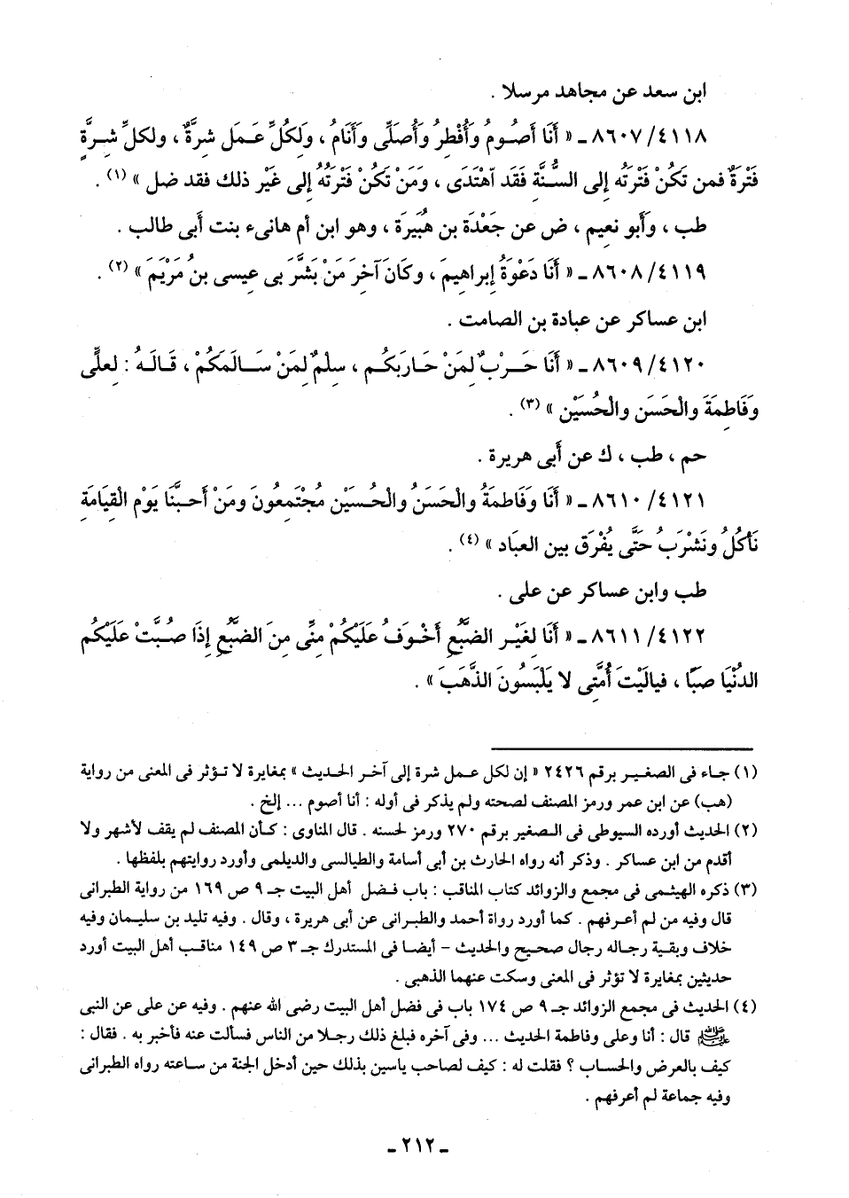 4120/ 8609 - "أَنَا حَرْبٌ لِمَنْ حَارَبكُم، سِلْمٌ لِمَنْ سَالَمَكُمْ، قَالَهُ: لِعلّى وَفَاطِمَةَ والْحَسَن والْحُسَيْن" (¬3).
