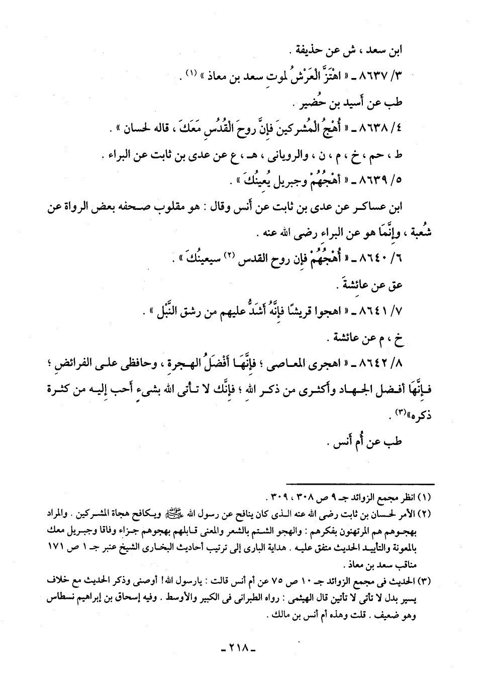 4/ 8638 - "أُهْجُ الْمُشركينَ فإِنَّ روحَ الْقُدُسِ مَعَكَ، قاله لحسان".