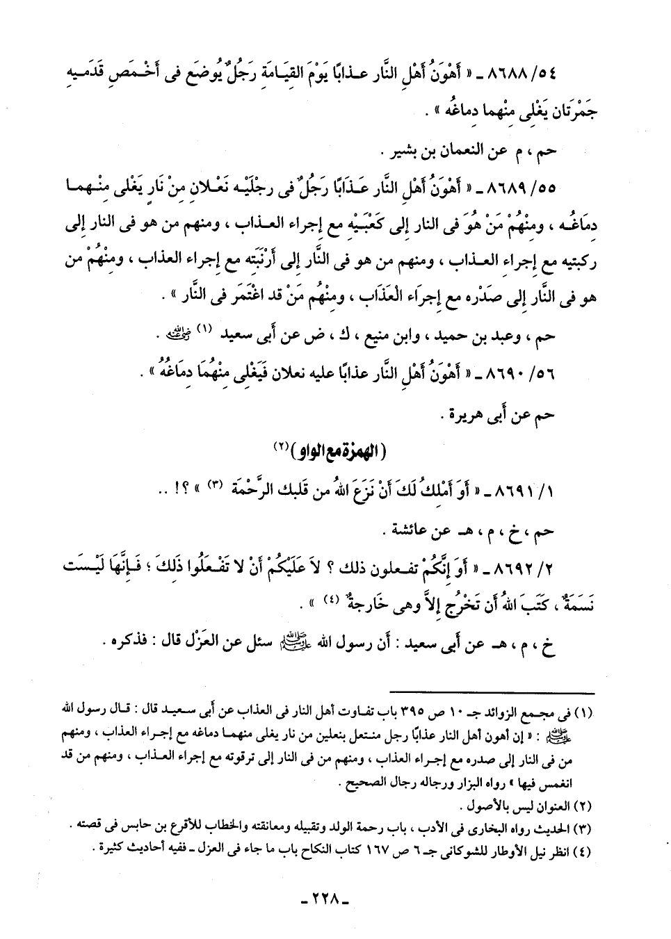 55/ 8689 - "أَهْوَنُ أَهْلِ النَّار عَذَابًا رَجُلٌ في رجْلَيْه نَعْلانِ مِنْ نَارٍ يَغْلى مِنْهما دِمَاغُه، ومِنْهُمْ مَنْ هُوَ في النار إِلى كَعْبَيْهِ مع إِجراء العذاب، ومنهم من هو في النار إِلى ركبتيه مع إِجراءِ العذاب، ومنهم من هو في النَّار إِلى أَرْنَبَتِه مع إِجراء العذاب، ومِنْهُمْ من هو في النَّار إِلى صَدْره مع إِجرَاء الْعَذَاب، ومِنْهُم مَنْ قد اغْتَمَر في النَّار".