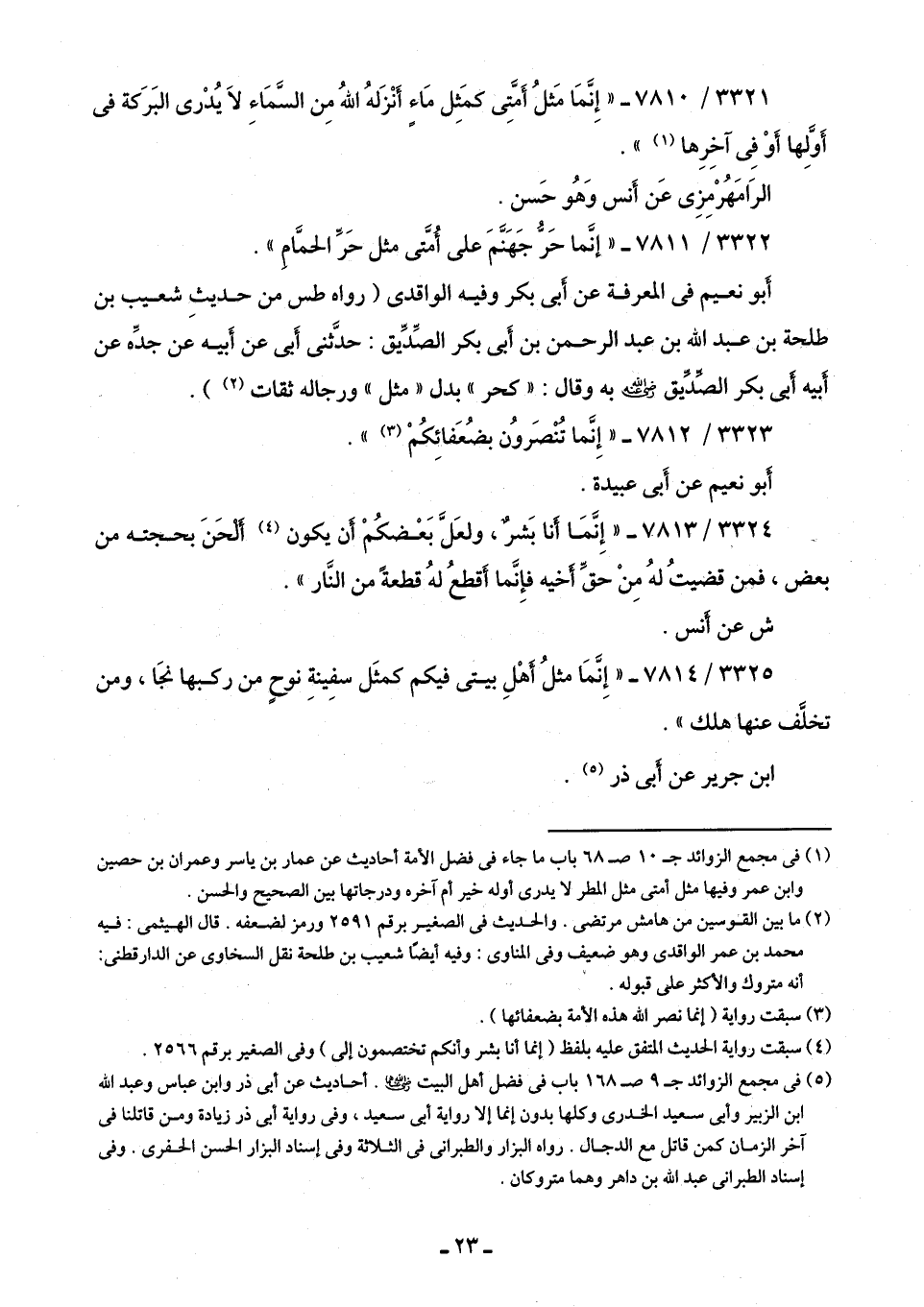 3325/ 7814 - "إِنَّمَا مثلُ أهْلِ بيتى فيكم كمثَل سفينة نوحٍ من ركبها نجَا، ومن تخلَّف عنها هلك".