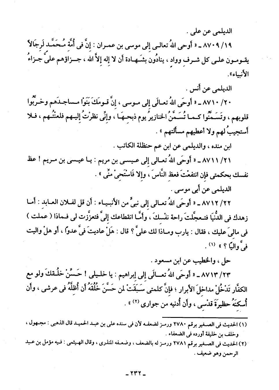 20/ 8710 - "أَوحَى اللَّهُ تعالَى إِلى موسى، إِنَّ قومَكَ بَنَوْا مساجدَهم وخرَّبُوا قلوبهم، وتَسَمَّنُوا كما تُسَمَّنُ الخنازيرُ يوم ذبحِهَا، وإِنِّى نظرْتُ إِليهم فلعنْتُهم، فلا أَستجيبُ لهم ولا أعطيهم مسأَلتهم".