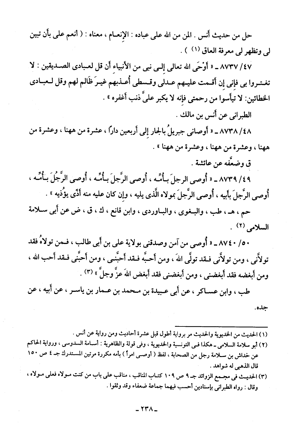 48/ 8738 - "أَوصانى جبريلُ بالجار إِلى أَربعين دارًا، عشرة من ههنا، وعشرة من ههنا، وعشرة من ههنا، وعشرة من ههنا".