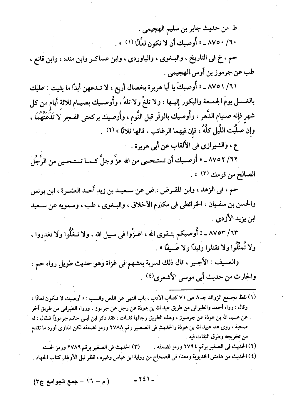 61/ 8751 - "أُوصيكَ يا أَبا هريرة بخصال أَربع، لا تدعهن أَبدًا ما بقيت: عليك بالغسل يومَ الجمعة والبكور إِليها، ولا تلغُ ولا تلهُ، وأُوصيك بصيام ثلاثةِ أيامٍ من كل شهرٍ فإِنه صيام الدَّهر، وأوصيك بالوتْر قبل النَّوم، وأُوصيك بركعتى الفجر لا تَدَعَنَّهُمَا، وإِن صلَّيْت اللَّيل كلَّهُ، فإِن فيهما الرغائب، قالها ثلاثًا" (¬2).