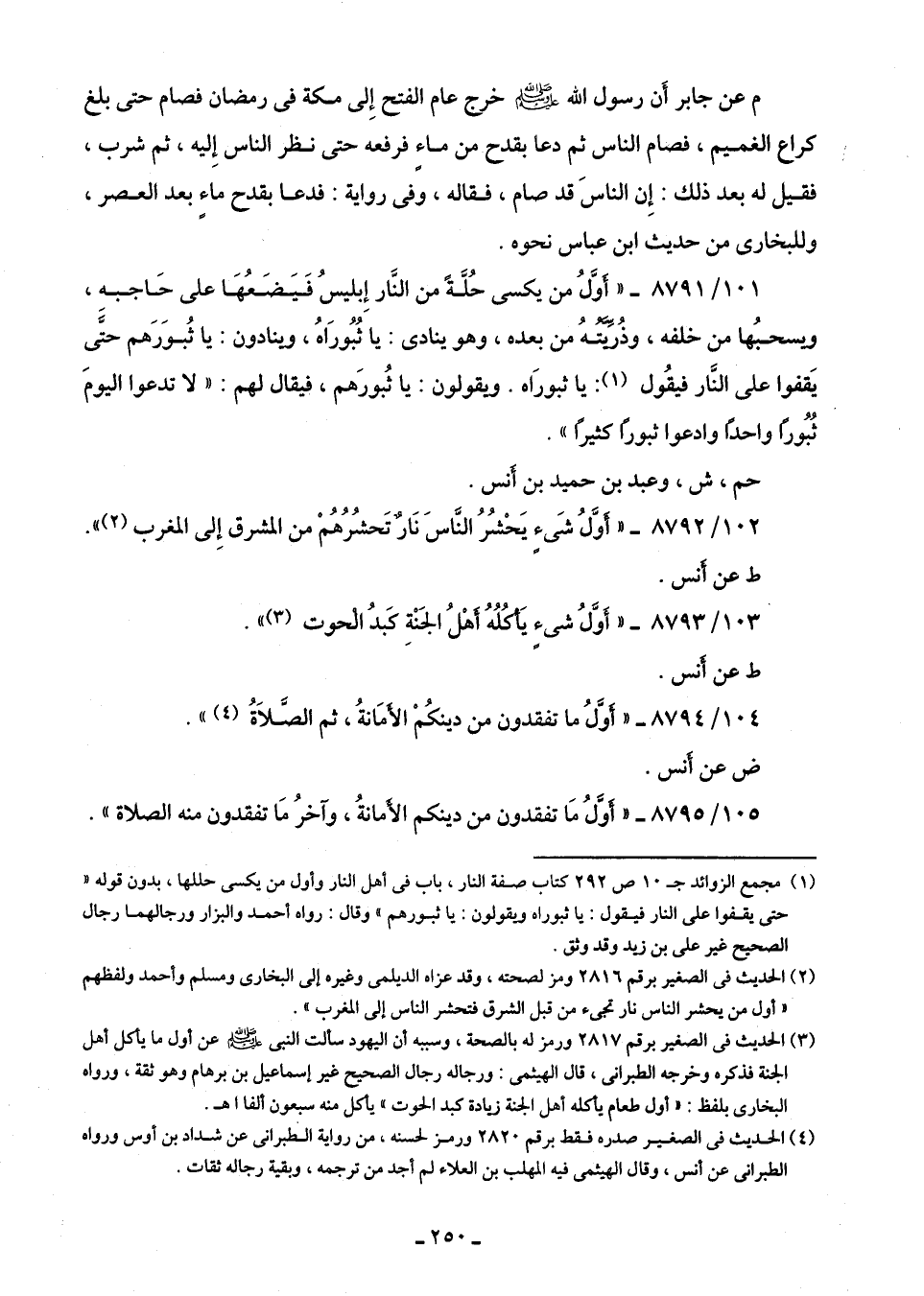 102/ 8792 - "أَوَّلُ شَئٍ يَحْشُرُ النَّاسَ نَارٌ تَحشُرُهُمْ من المشرق إِلى المغرب (¬2) ".