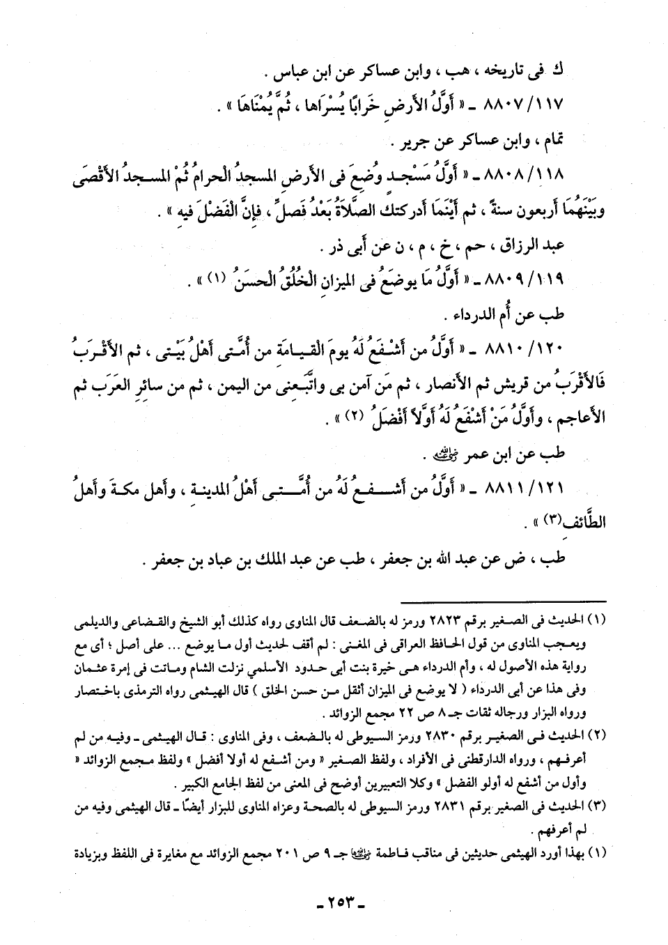 120/ 8810 - "أَوَّلُ من أشْفَعُ لَهُ يومَ الْقيامَةِ من أمَّتى أَهْلُ بَيْتى، ثم الأَقْرَبُ فَالأَقْرَبُ من قريش ثم الأنصار، ثم مَن آمن بى واتَّبَعِنى من اليمن، ثم من سائِرِ العَرَب ثم الأَعاجم، وأوَّلُ مَنْ أشْفَعُ لَهُ أوَّلًا أَفْضَلُ (¬2) ".