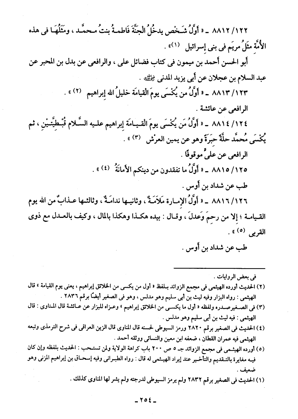 124/ 8814 - "أَوَّلُ مَن يُكْسَى يومَ القيامَة إِبراهيم عليه السَّلام قُبْطِيَّتيْنِ، ثم يُكْسَى مُحمَّد حلَّةً حِبَرَةً وهو عن يمين العرْش (¬3) ".