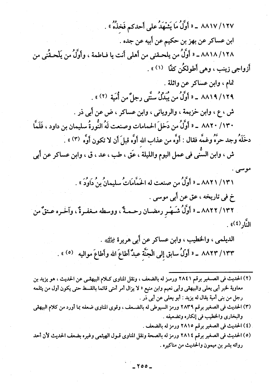 130/ 8820 - "أَوَّلُ من دَخلَ الحمامات وصنعت لَهُ النُّورةُ سليمان بن داود، فَلَمَّا دخَلَهُ وجد حرَّهُ وغمَّه فقال: أوَّه من عذاب اللَّهِ أوَّه قبلَ أَن لا تكون أوَّه (¬3) ".