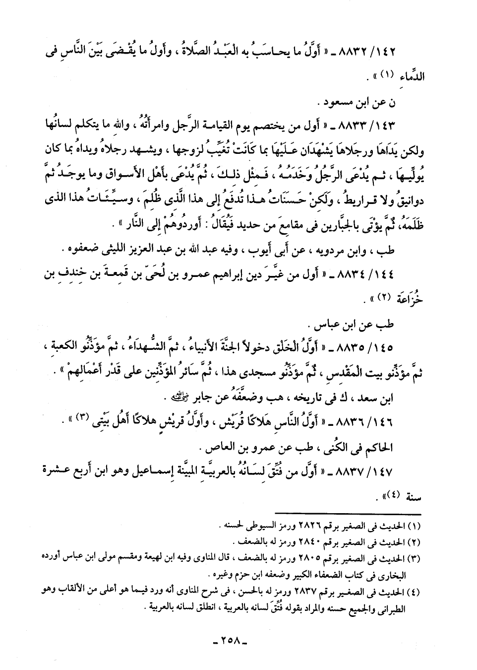 142/ 8832 - "أَوَّلُ ما يحاسَبُ به الْعَبْدُ الصَّلاةُ، وأولُ ما يُقْضَى بَيْنَ النَّاسِ في الدِّماء (¬1) ".