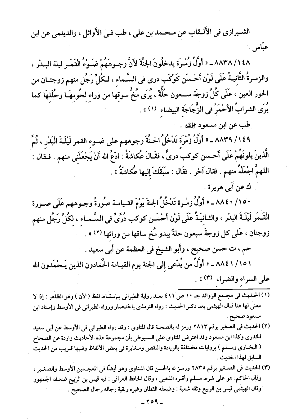 150/ 8840 - "أَوَّلُ زُمْرة تَدْخُلُ الجنَّةَ يَوْمَ القيامة صُورةُ وجوههم عَلَى صورة الْقَمَر لَيْلَةَ البدْر، والثانِيَة عَلَى لَوْن أَحْسَن كوكب دُرِّىِّ في السَّماء، لكُلِّ رَجُل منهم زوجتان، عَلى كل زوجةَ سبعون حلةً يبدو مُخ ساقها من ورائِها (¬2) ".
