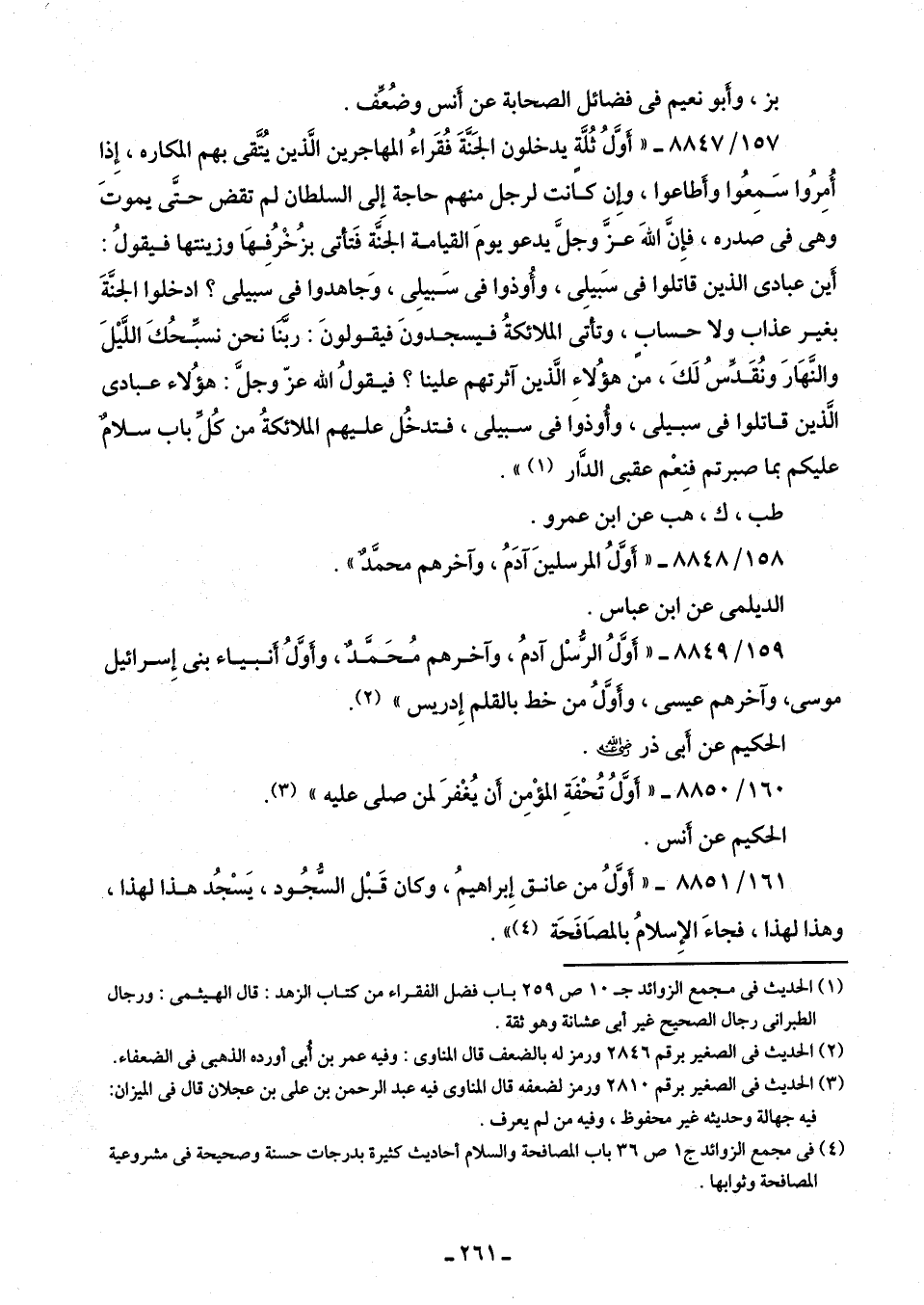 157/ 8847 - "أَوَّلُ ثُلَّةٍ يدخلون الجَنَّةَ فُقَراءُ المهاجرين الَّذين يُتَّقى بهم المكاره، إِذا أُمِرُوا سَمِعُوا وأَطاعوا، وإِن كانت لرجل منهم حاجة إلى السلطان لم تقض حتَّى يموتَ وهى في صدره، فإنَّ اللَّهَ عزَّ وجلَّ يدعو يومَ القيامة الجَنَّة فَتأتى بزُحرُفهَا وزينتها فيقولُ: أين عبادى الذين قاتلوا في سَبيلِى، وأُوذوا في سَبيلِى، وَجاهدوا في سَبيلى؟ ادخلوا الجنَّةَ بغير عذاب ولا حساب، وتأتى الملائكةُ فيسجدونَ فيقولونَ: ربَّنَا نحن نسبِّحُكَ اللَّيْلَ والنَّهَارَ ونُقَدِّسُ لَكَ، من هؤُلاءِ الَّذين آثرتهم علينا؟ فيقولُ اللَّه عزّ وجلَّ: هؤُلاء عبادى الَّذين قاتلوا في سبيلى، وأُوذوا في سبيلى، فتدخُل عليهم الملائكةُ من كُلِّ باب سلامٌ عليكم بما صبرتم فنِعْم عقبى الدَّار (¬1) ".