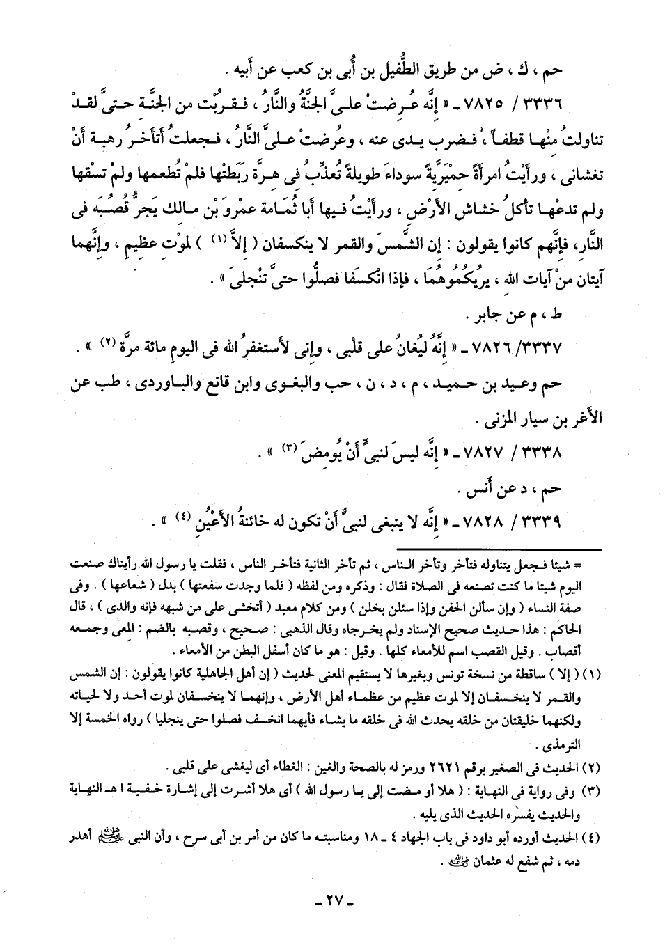3337/ 7826 - "إِنَّهُ ليُغانُ على قلبى، وإِنى لأَستغفرُ اللَّه في اليومِ مائة مرَّة (¬2) ".