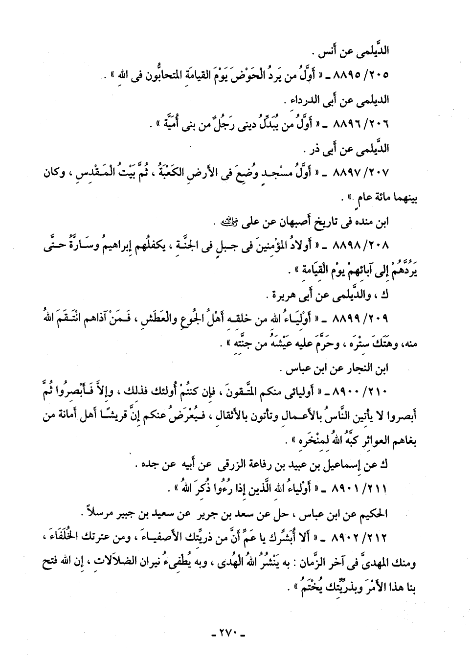 210/ 8900 - "أوليائى منكم المتَّقونَ، فإِن كنتُمْ أُولئك فذلِك، وإِلَّا فَأبْصِرُوا ثُمَّ أبصروا لا يأتِين النَّاسُ بالأعمالِ وتأتون بالأَثقالِ، فيُعْرَضُ عنكم إِنَّ قريشًا أَهل أَمانة من بغاهم العواثِر كبَّهُ اللَّهُ لِمِنْخَرهِ".