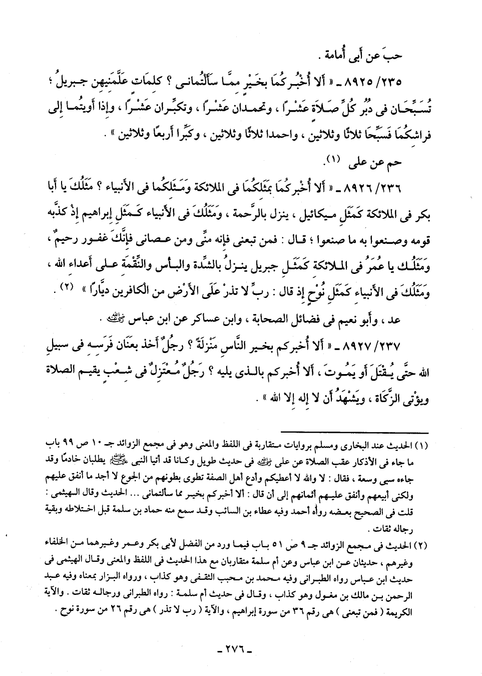 237/ 8927 - "أَلا أُخبركم بخير النَّاسِ مَنْزلَةً؟ رجُلٌ أَخذ بعَنَان فَرَسِهِ في سبيلِ اللَّه حتَّى يُقْتَلَ أو يَمُوتَ، ألا أُخبركم بالذى يليه؟ رَجُلٌ مُعْتَزِلٌ شِعْبٍ يقيم الصلاة وبؤْتى الزَّكَاة، ويَشْهَدُ أن لا إِله إِلا اللَّه".