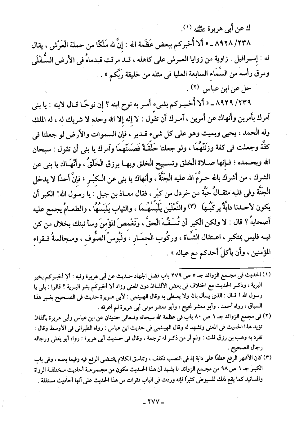 238/ 8928 - "أَلا أُخبركم ببعض عَظَمة اللَّه: إِنَّ للَّه مَلَكًا من حملة الْعَرْش، يقال له: إِسرافيل. زاوية من زوايا العرش على كاهله، قد مرقت قدماهُ في الأرض السُّفْلَى ومرق رأْسه من السَّمَاءِ السابعة العليا في مثله من خليقة ربِّكم".